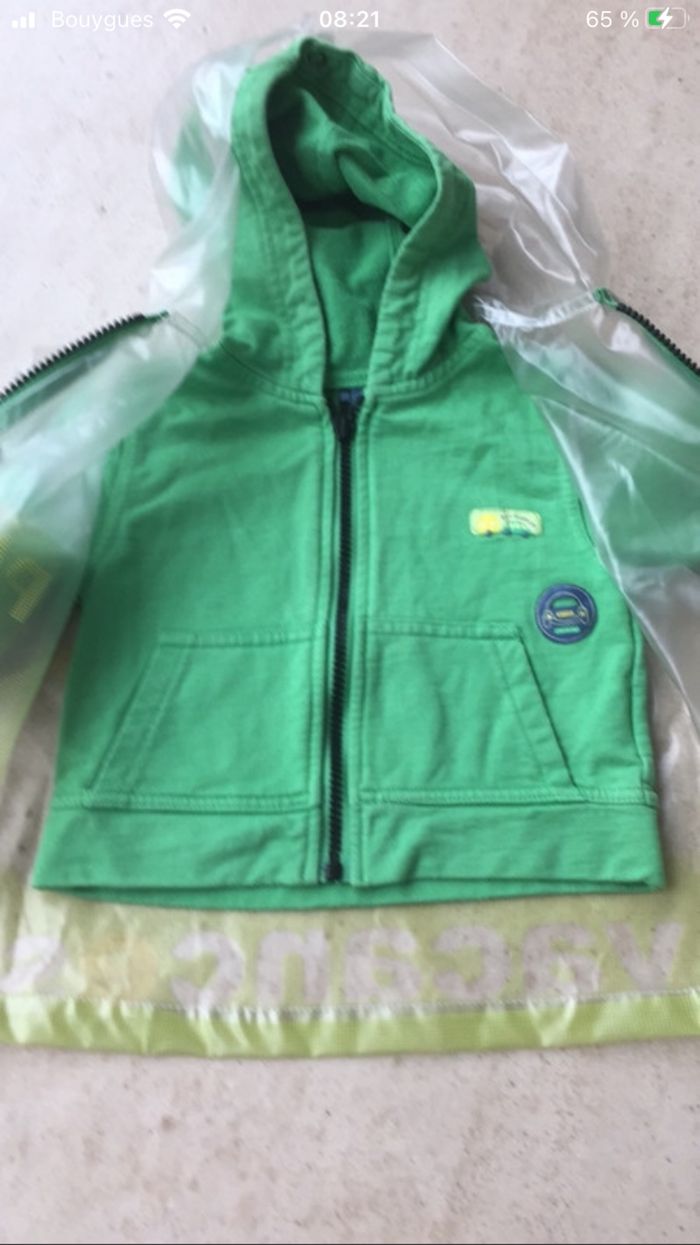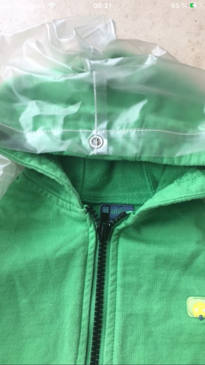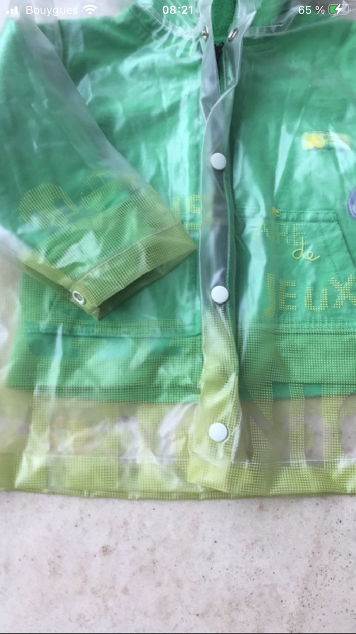 Imperméable qui se compose d’un gilet s’accrochant à un imperméable transparent avec dessins et écritures jaunes. 18 mois= 81 cm