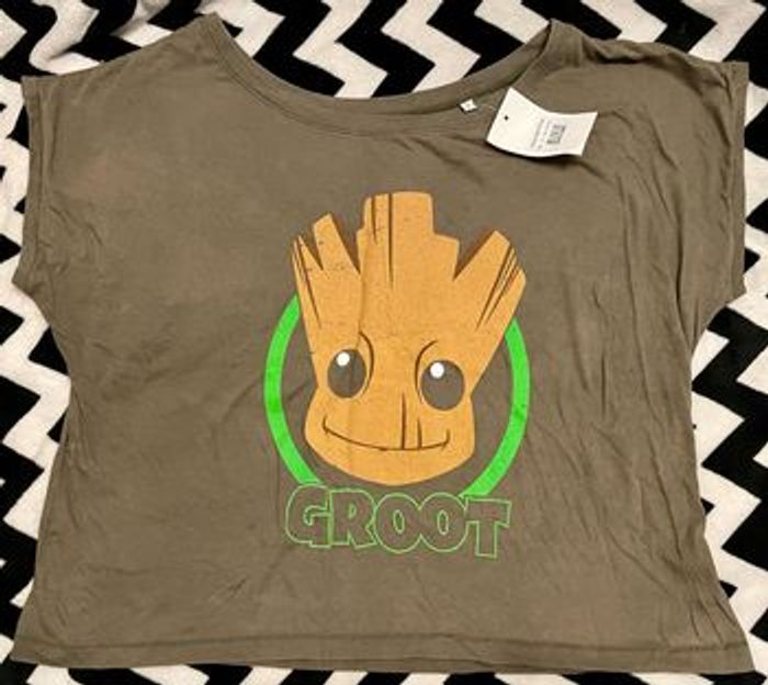 Tee shirt ample de la licence des Gardiens de la Galaxie de Marvel Taille 2 / M (taille grand) Couleur kaki État neuf avec étiquette (voir photos état tel qu’acheté)