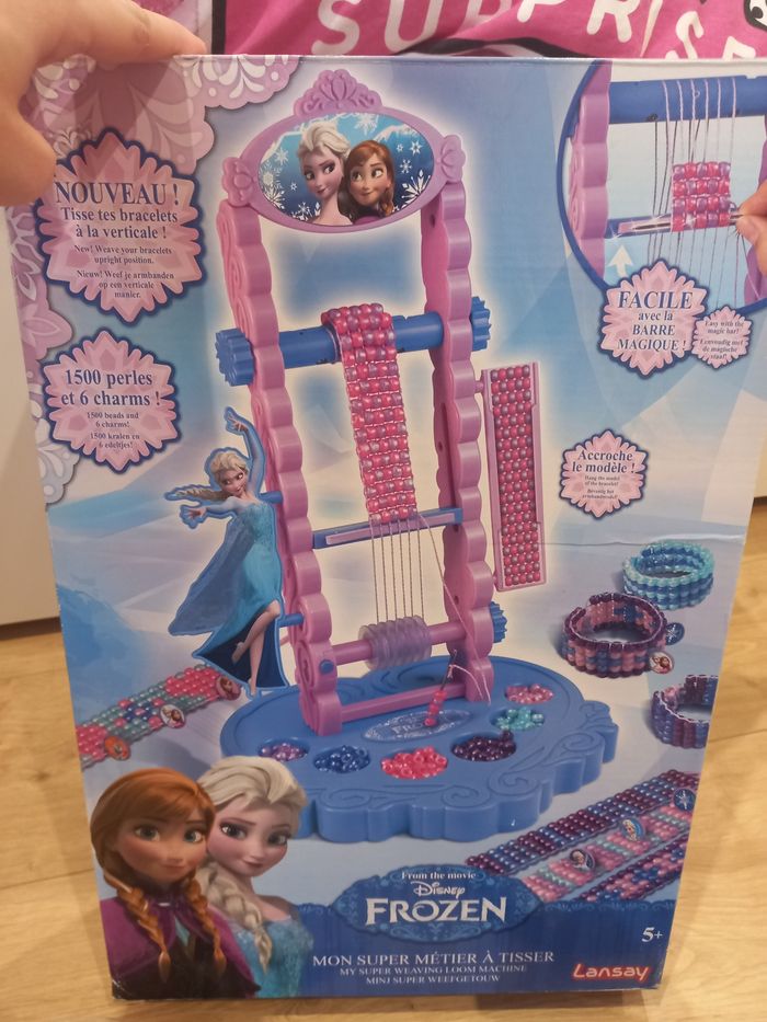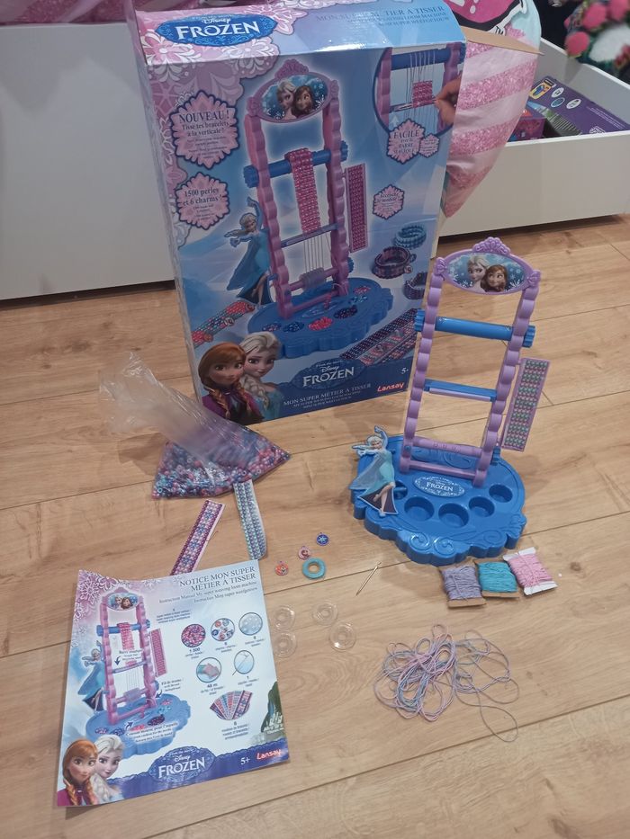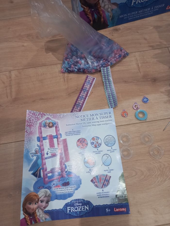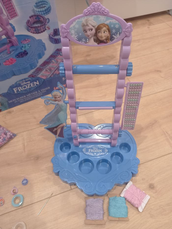 Metier à tisser La Reine des Neiges de la marque Lansay. A été peu utilisé. Il reste 3 charmes sur 6 5 bobines pour faire les rangs de bracelets sur les 6 (il en manque donc une, mais permet de faire quand même des bracelets). Perles, fils et aiguille. Kit permettant de faire encore pas mal de bracelets.