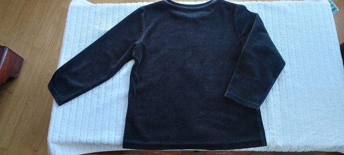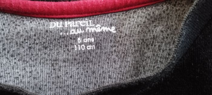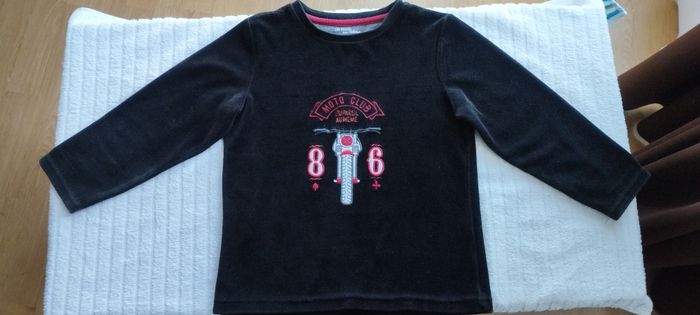 Pull pour enfant de 6ans de la marque Du Pareil au Même. Couleur Noir et imprimé broderie Moto Gris Blanc Rouge, matière douce velours et extensible ! Très bon état.
