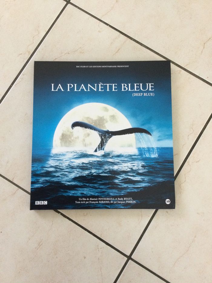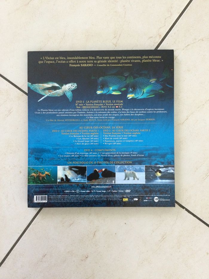 Livre coffret la planète bleue, 4 dvd dont la planète bleue le film, 2 dvd au cœur des océans et un dvd compléments. Un portfolio de 15 grandes photos de collection. Année 2009. Éditions Montparnasse.