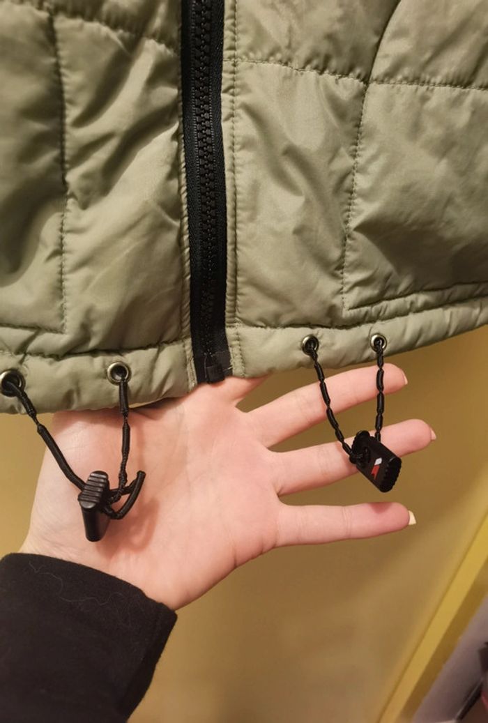 Souvent porté Taille L Doudoune femme. Fermeture éclair, bouton au col pr y mettre une capuche (que je n'ai plus), 2 poches Couleur vert, vert kaki Liens qui servent à resserrer en bas de la doudoune craquel (voir photo) #carolinevêtementsL #carolinegilet #doudounesansmanche