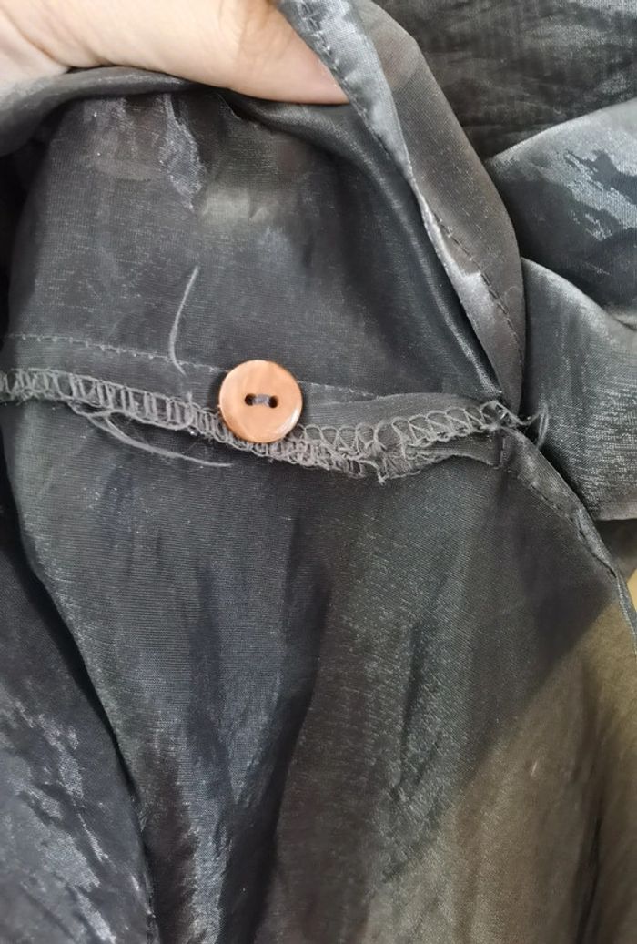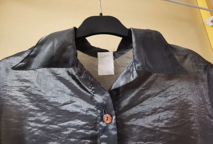 Souvent portée Taille 38 #carolinevêtementsM #carolinehaut #chemise Chemise grise satiné transparente Bouton de rechange à l'intérieur Quelques accrocs (voir photo)