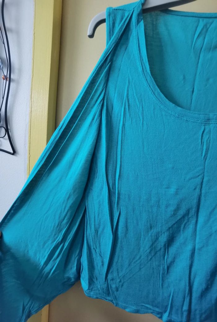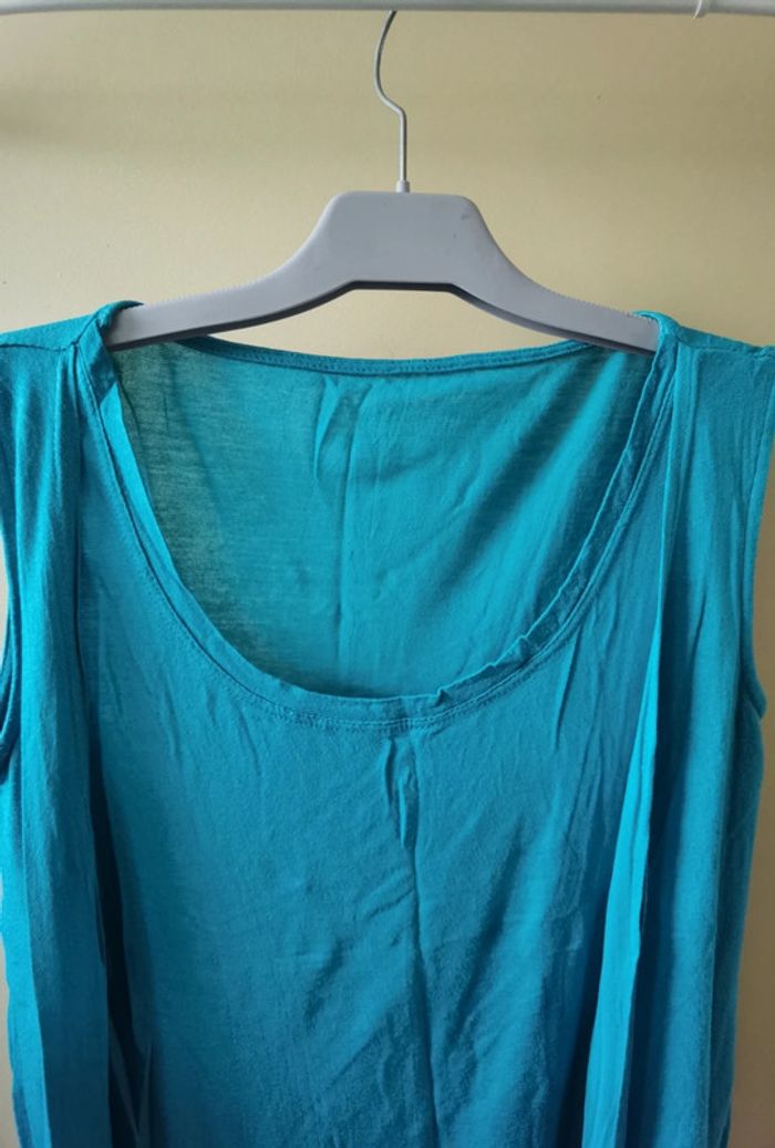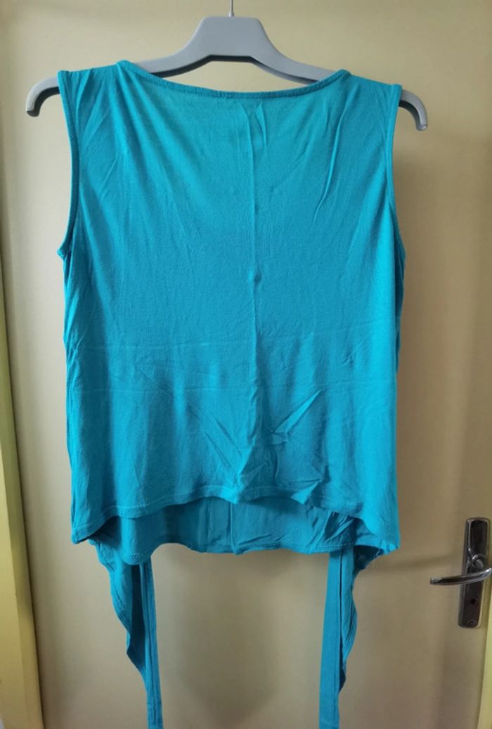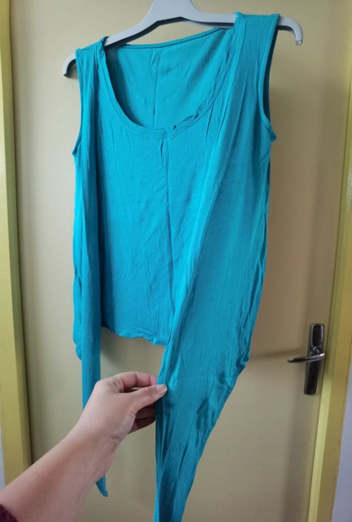 Souvent porté Taille M #carolinevêtementsM #carolinevêtementsL Matière élastique Effet "gilet" cousu Noté L mais taille entre le M et le L Longueur totale environ 59cm (épaule jusqu'au bas de t-shirt) et 94cm (jusqu'au bas de l'effet gilet) Pas de défaut constaté
