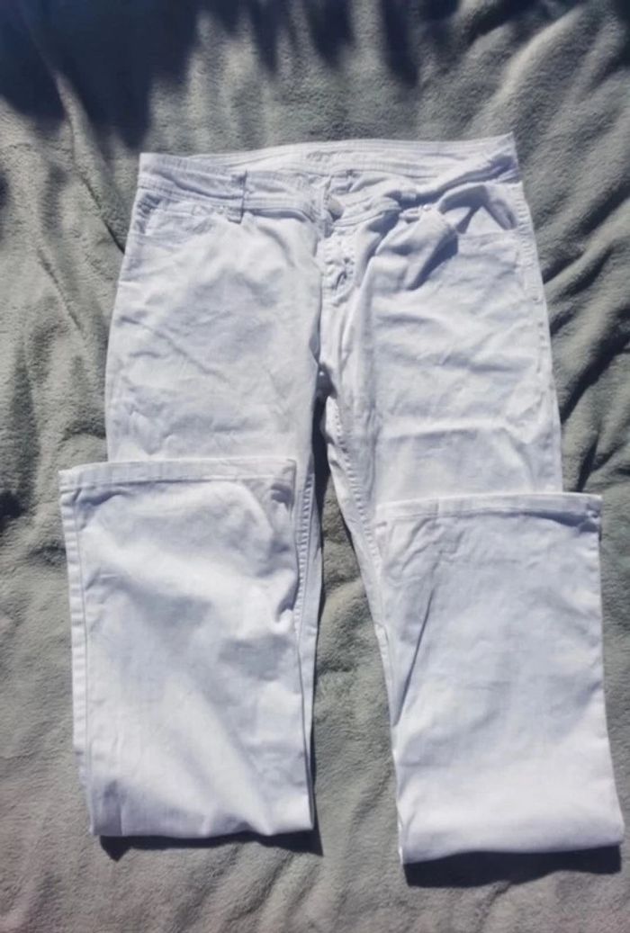 Pantalon blanc Taille 40 #carolinevêtementsL #carolinepantalon #carolinejean N'a plus d'étiquette 2 grandes poches devant +1petite et 2 poches derrière Possibilité de mettre une ceinture d'environ 4 à 4.5cm de largeur Longueur a l'entre-jambe environ 77cm Largeur au pied environ 23cm Petit défaut au niveau du bouton de fermeture (à perdu 1 peu sa couleur blanche) et derrière sur les poinçons de décoration "denim" Porté environ 5 fois