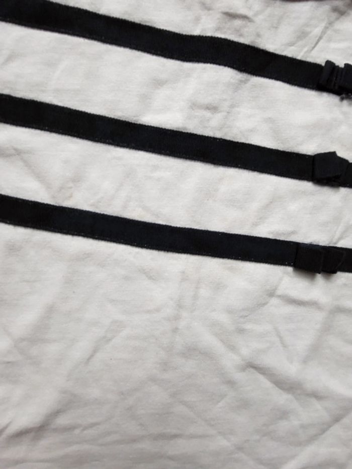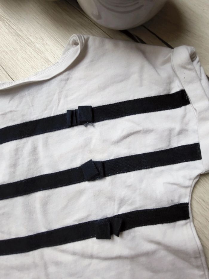 Tee-shirt court style marinière. Jacadi taille 4 ans. Blanc et bleu marine. Trop mignon avec petits nœuds. Attention minis tâches microscopiques à signaler (cf. dernière photo). #4anstatiana #4ans #jacadi #marinière #bleumarine #croctop