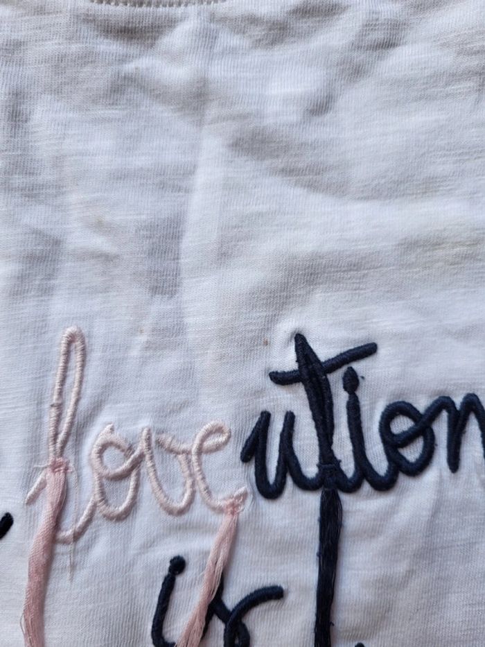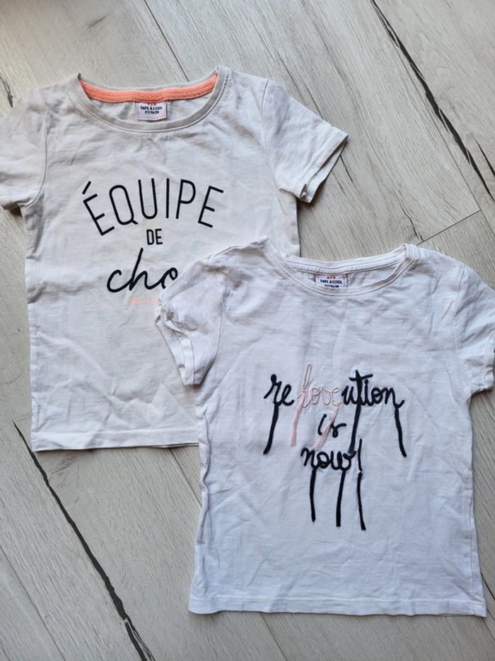 Lot de 2 tee-shirts blancs tape à l'œil. Taille 3ans. Minis tâches à signaler, peu visibles (cf.photos). Les tissus sinon sont en excellent état. #3anstatiana #lot #tee-shirts #lotteeshirts #tao #tapealoeil #3ans #été #equipedechoc #révolution
