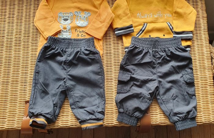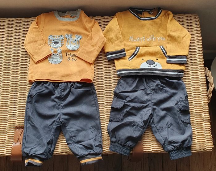 Lot de 2 ensembles jaune moutarde et gris. Marque plus en 3 mois. Très bon état