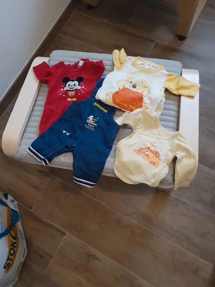 1 pyjama velours (rouge) taille naissance 1 pyjama coton (jaune) taille 1m 1 salopette taille 1m 1 body manches longues taille 3m (à donner) #bebegarcon #disneybaby #pyjamabébé