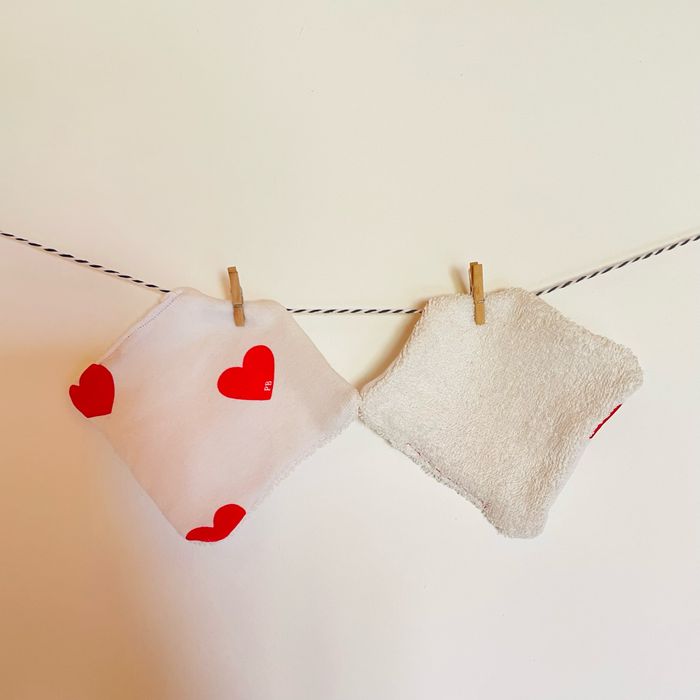 Lot de 4 carrés de coton réutilisables pour la toilette de bébé et/ou de maman :) 1 face en coton imprimé coeurs 1 face en éponge 11x11 cm environ Fait main à partir de chutes de tissu d’un pyjama Petit Bateau.