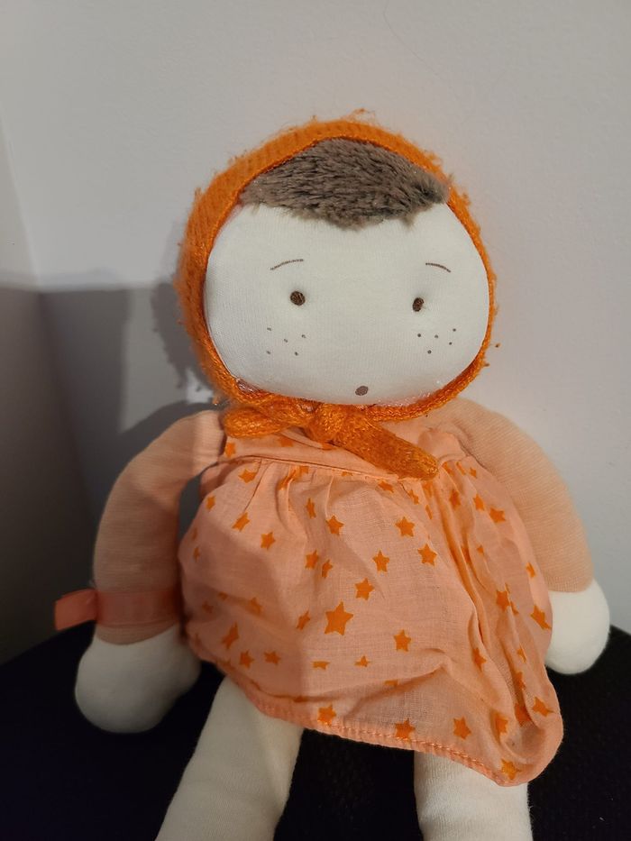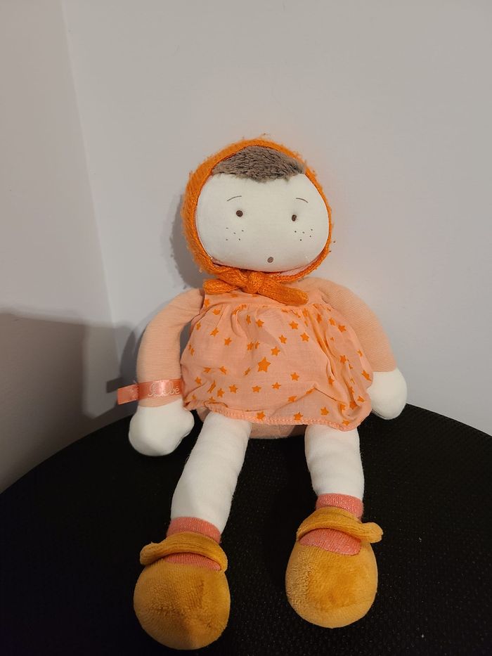 DOUDOU POUPÉE ROSE ORANGE ÉTOILES LES COQUETTES MARGOT MOULIN ROTY 30 cm env