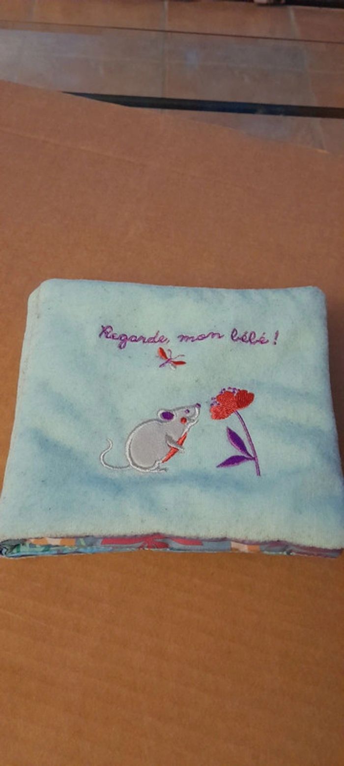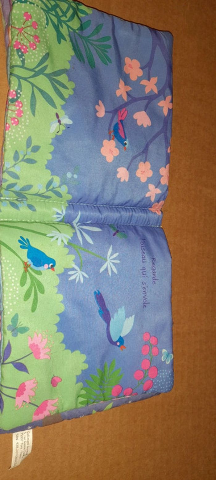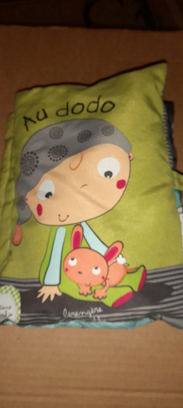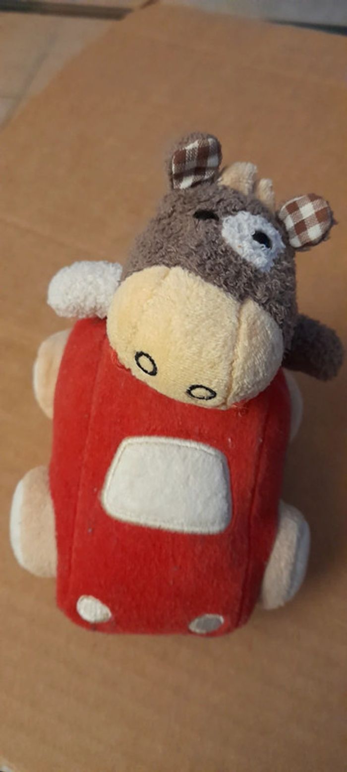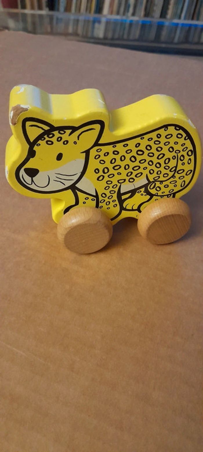 2 livres tissus 1 voiture peluche 1 hochet peluche 1 peluche poussin 1 léopard à roulettes en bois (avec qq éclats de peinture - voir photo)