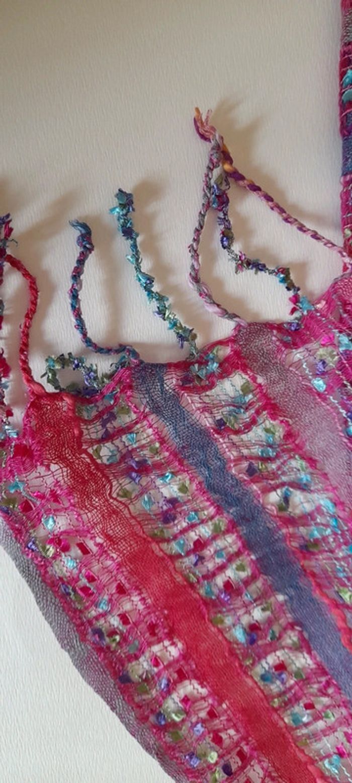 Echarpe ajourée multicolore à dominante rose et violette Dimensions 50 x 120