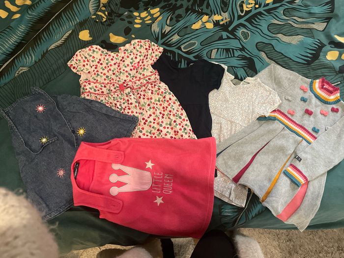 Vends lot petites robes pour fille - robe en jean avec broderie miroir, se noue sur le cou, dos nu. Taille 1 an / marque Absorba - robe rose avec couronne brodée « Little Queen », en polaire à bretelle avec boutons. Taille 86 cm / marque In Extenso - robe rose clair avec motif fraise, avec bomber petite manche et ceinture à la taille. Taille 18 mois 80 cm / marque Sergent Major - robe bleu marine et bleu clair avec motif fleurs blanches, 100% coton. Très légères et pratiques pour l’été, manches courtes. Taille 12 mois / marque Kiabi - robe grise clair manches longues et petits noeuds colorés sur le devant. Fermeture boutonnée dans le dos. En coton et acrylique. Taille 18 mois 83 cm / marque Tuc Tuc (marque italienne) Photos sur demande 🙂