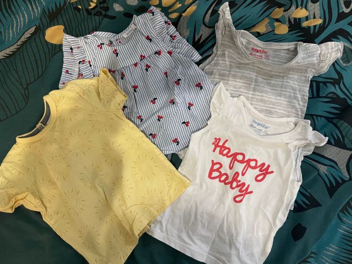 Vends 4 tee shirt manches courtes - le blanc et le gris rayé : marque Lupilu / taille 6/12 mois 74/80cm. Pression au niveau des épaules. - le jaune motif ton sur ton soleil : marque P’tit Bisou / taille 9 mois 71 cm. Pression sur tout le dos. - le bleu clair motif cerise : marque Bout’chou / taille 9 mois. Boutons sur tout le dos.