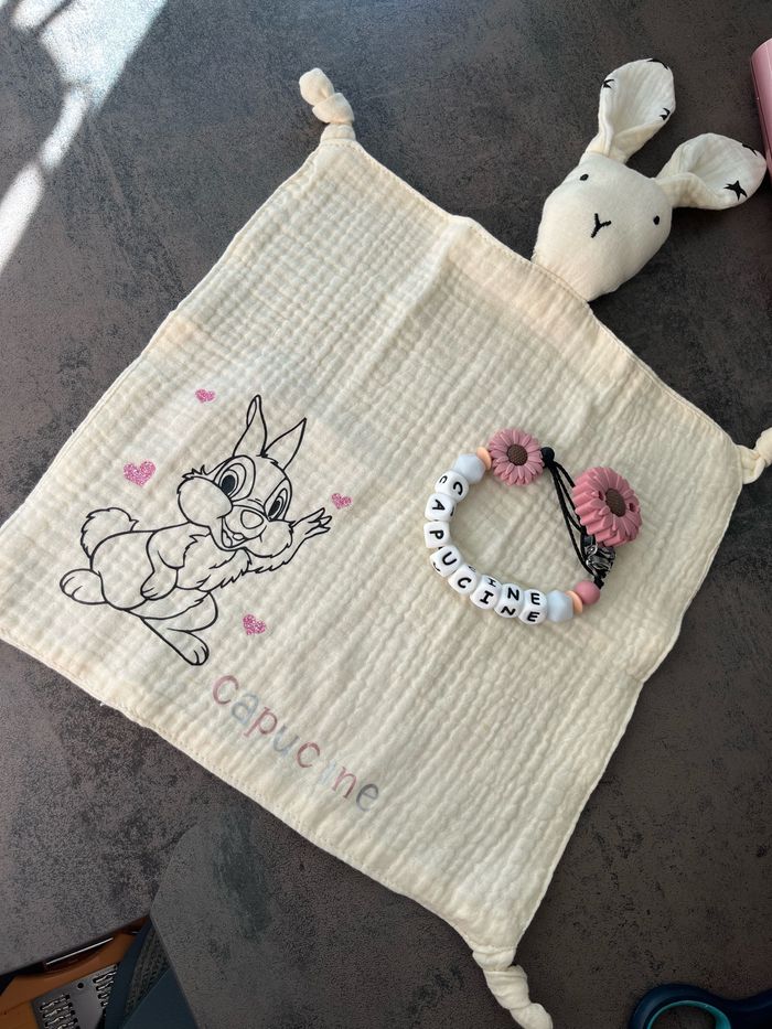 Bonjour voici mets création doudou personnalisé plus attache tétine n’hésite pas à demandé plus d’informations en privé