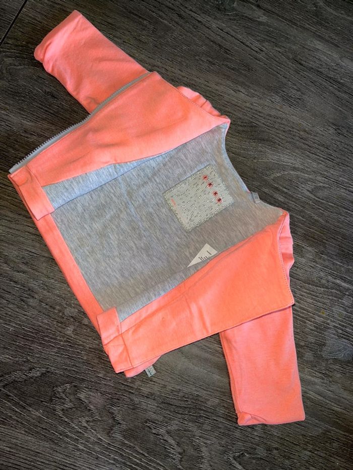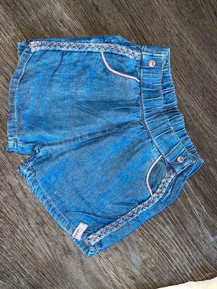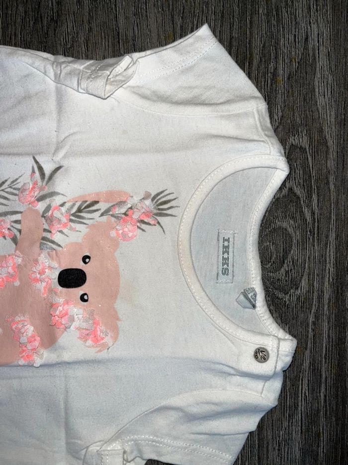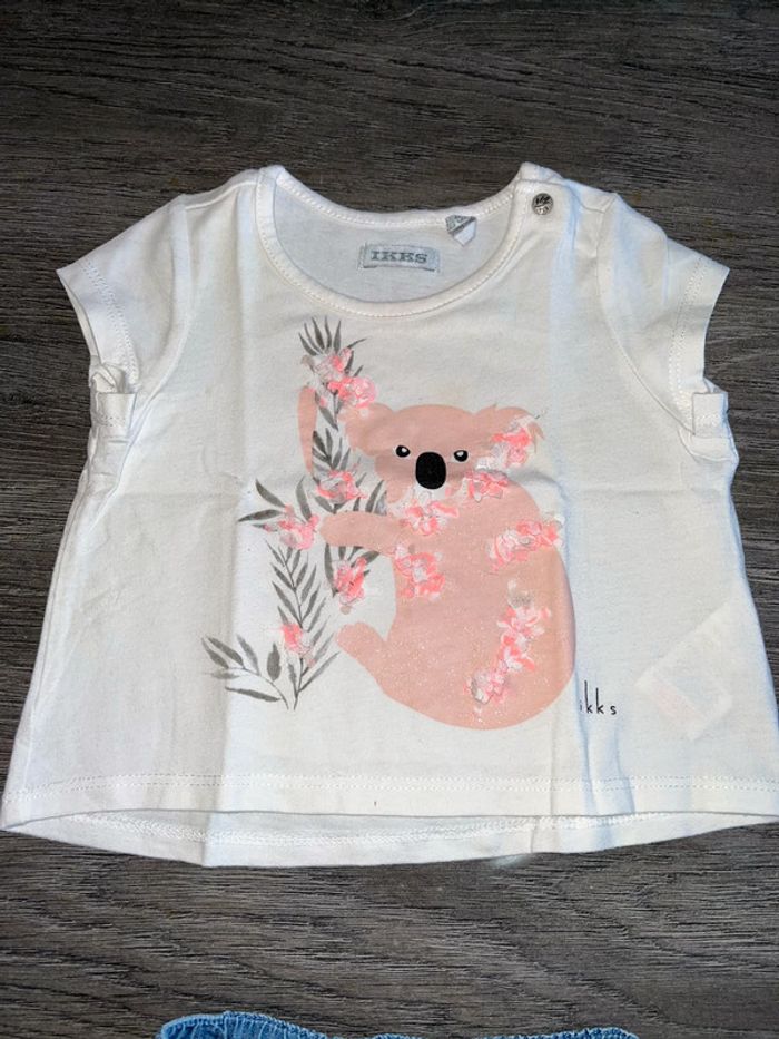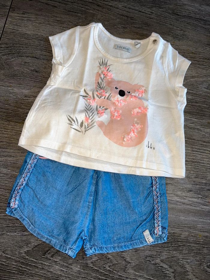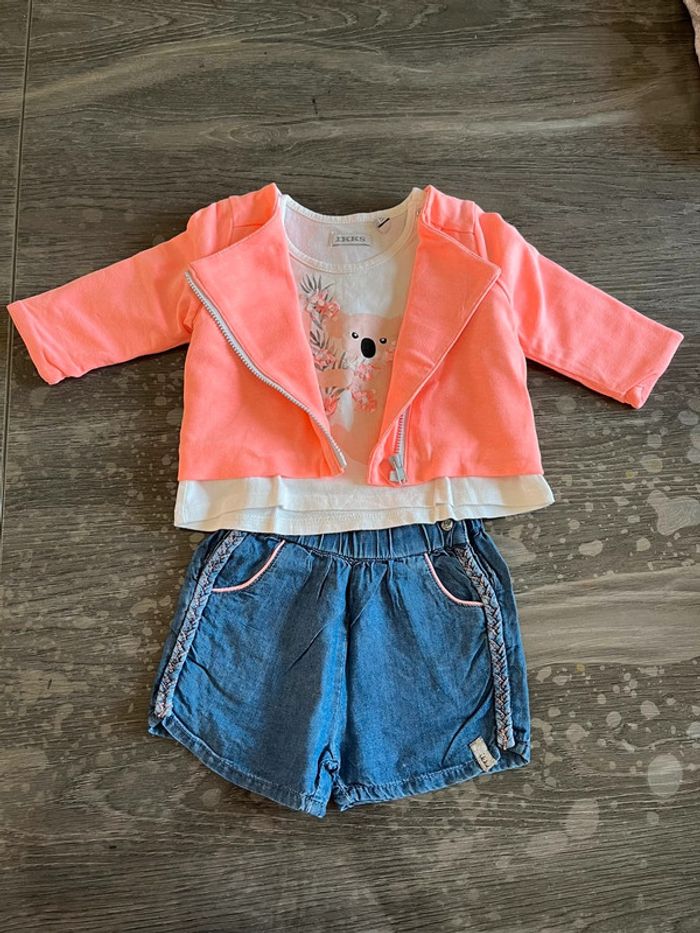 très bel ensemble bebe fille 6 mois ikks short, t-shirt manches courtes + haut manches longues avec fermeture tres légère tache sur le t-shirt