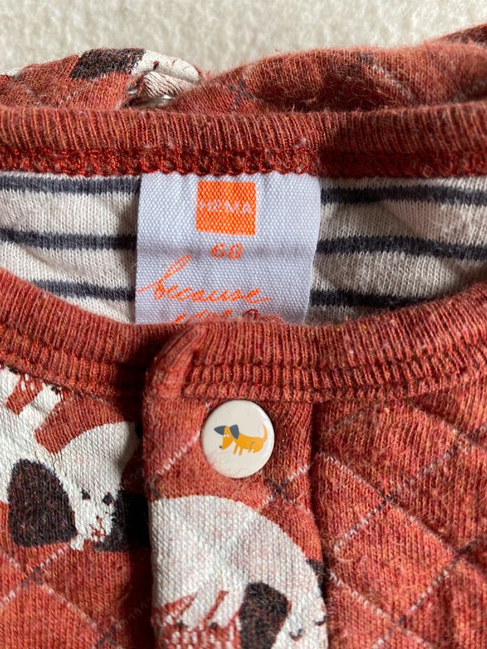 68 cm - taille assez petit / Combinaison Hema avec pressions à l’entrejambe. Quelques bouloches mais excellent état à part ça.