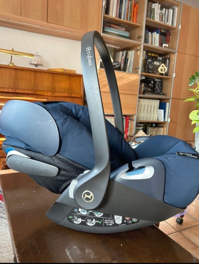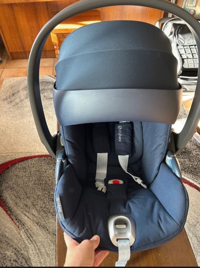 Coque cosy CYBEX Cloud Z I-Size Nautical Blue Convient pour bébé de 0 à 13 kg soit environ 18 mois. Contient un réducteur amovible. Utilisée 4 fois, uniquement sur courts trajets, état impeccable quasi neuf. N’a jamais subi le moindre choc, pas une égratignure. 150€ Actuellement encore en vente neuf à 260€ sur le site Vertbaudet par exemple.