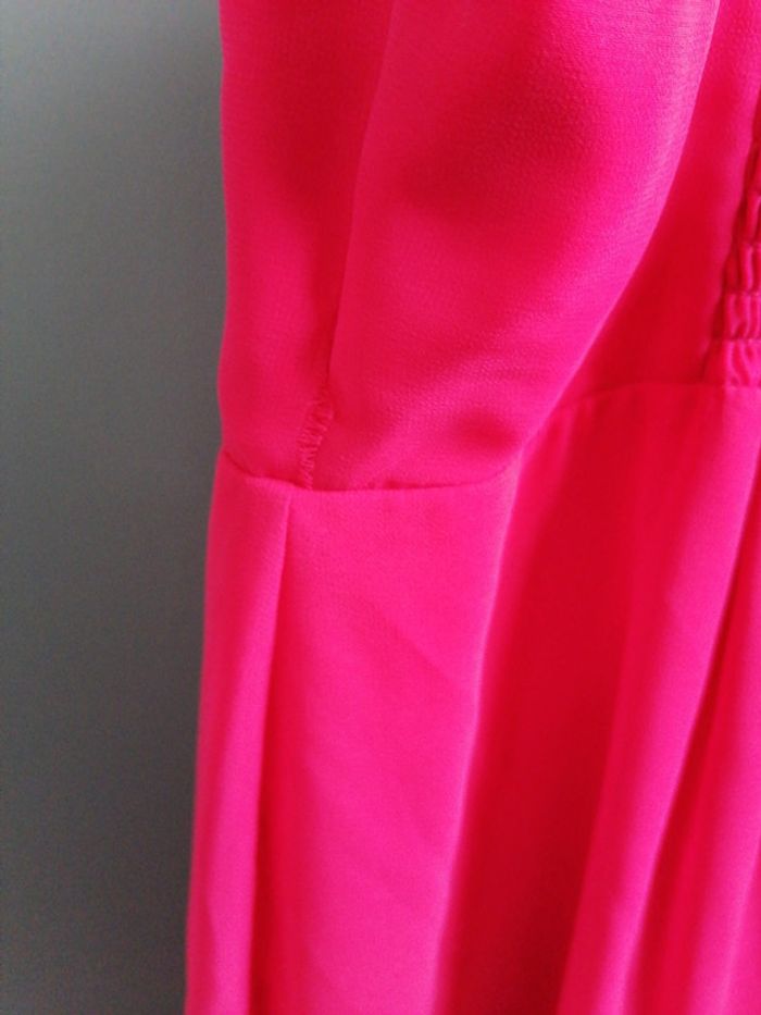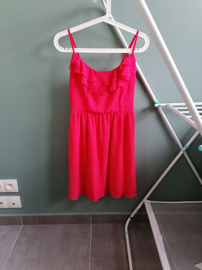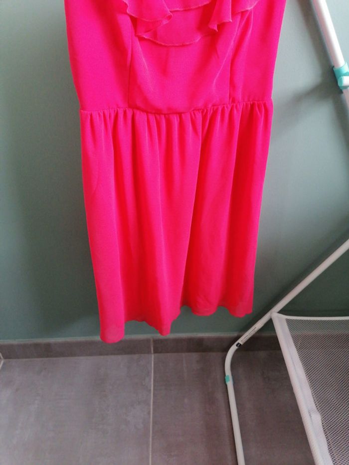 Robe fluide, très agréable à porter, doublée, rose fushia. Idéale événement type mariage, baptême, anniversaires... En très bon état car portée à 2 ou 3 occasions. Un endroit où c'est un peu décousu (voir photo) mais c'est sur la première doublure donc ne gêne pas, pas de trou dans la robe. Taille 36 (manque l'étiquette).
