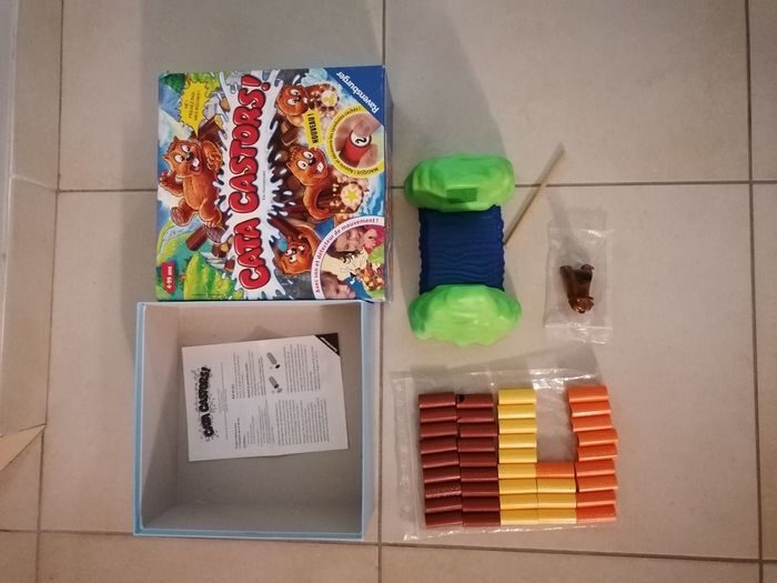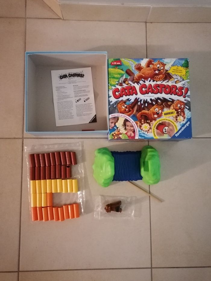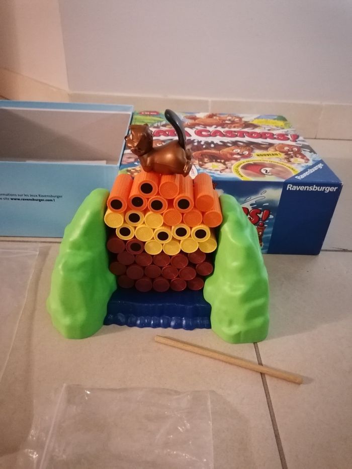 A partir de 4 ans. Boîte en bon état, qqs traces d'usure. Jeu quasi complet : il manque 2 bûches marrons ce qui n'empêche en rien tout le fonctionnement du jeu. Et, il y en a 2 de "coqués" (cf photos) mais sont tout à fait utilisable. Le dessous du castor a pris un choc également mais il fonctionne très bien je peux envoyer une vidéo avec son si souhaité. Heures de fous rires garanties !!