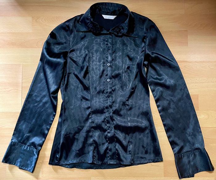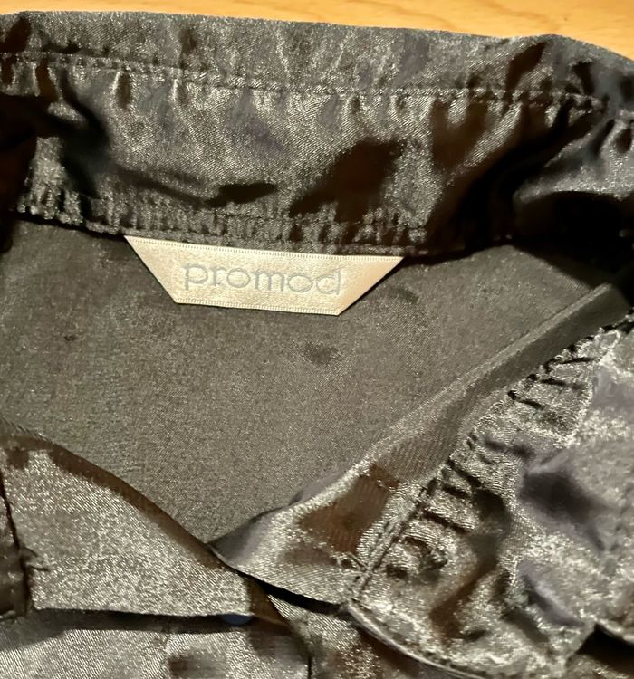 Chemisier en satin de la marque Promod Taille 36 Dimensions largeur aux épaules 35 cm, largeur à la poitrine 40 cm, longueur 61 cm Traces d’utilisation, petites griffes Occasion, bon état