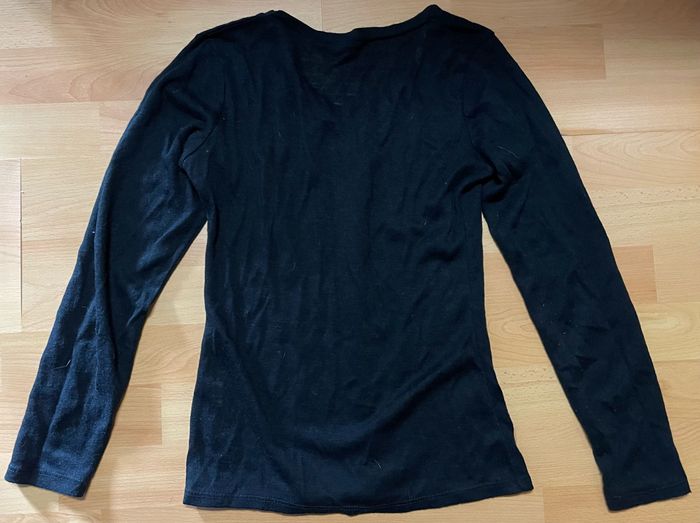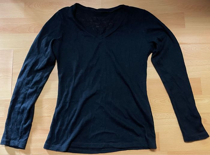 Pull fin col en V noir Taille S Dimensions largeur aux épaules 34 cm, largeur à la poitrine 40 cm, longueur 56 cm Occasion, bon état