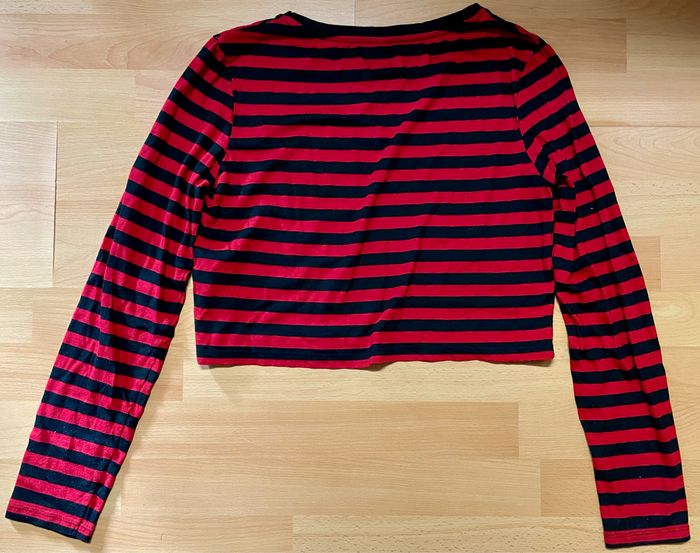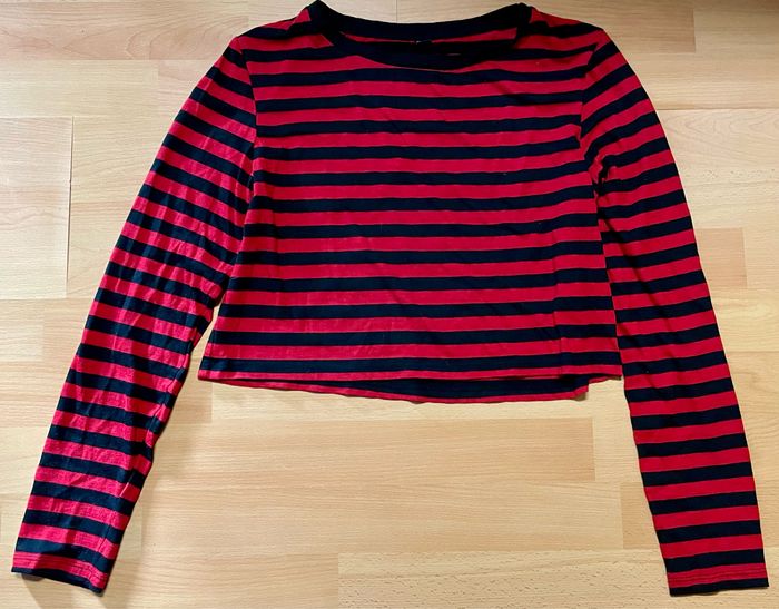 Tee shirt court à manches longues de la marque Pimkie Taille M Dimension largeur aux épaules 38 cm, largeur à la poitrine 45 cm, longueur 40 cm Petites traces d’utilisation Occasion, bon état