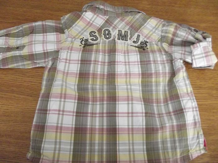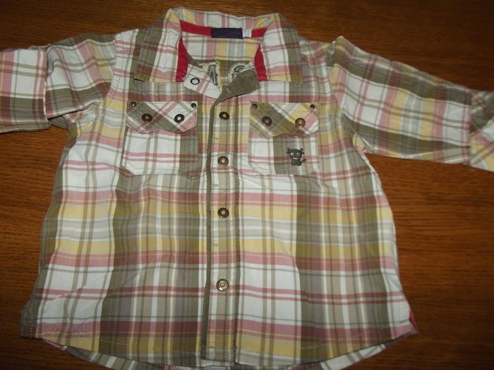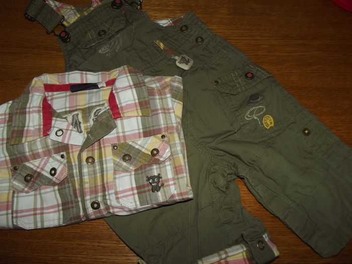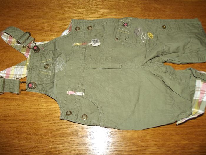 1 chemise manches longues il fait trop chaud on relève les manches et il y a une pression. écriture dans le dos. La pression du haut sur la chemise ne fonctionne plus, mais bon cela est pas méchant la salopette même chose sur les jambes on relève s'il fait trop chaud il y a des pressions entre les jambes pour faciliter aussi le changement de la couche en bon état sinon