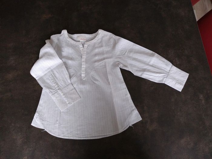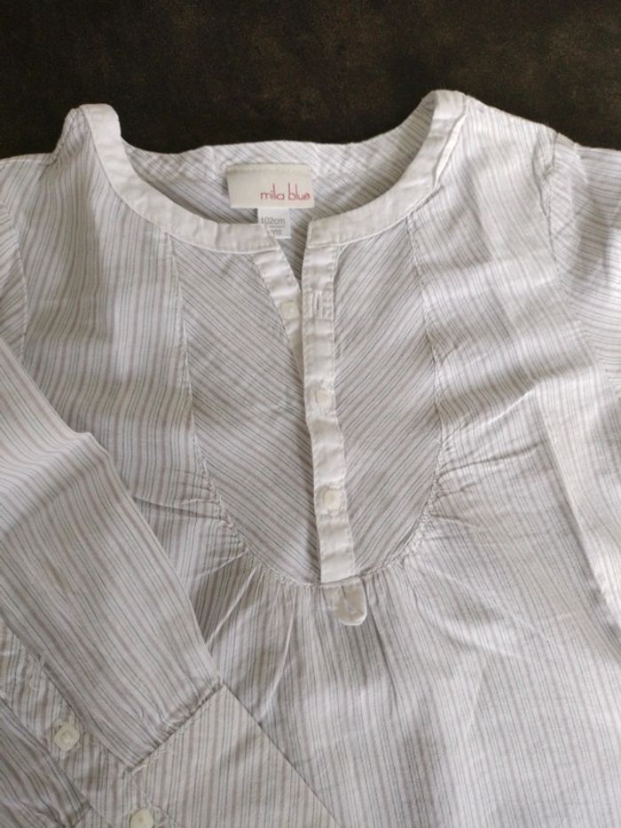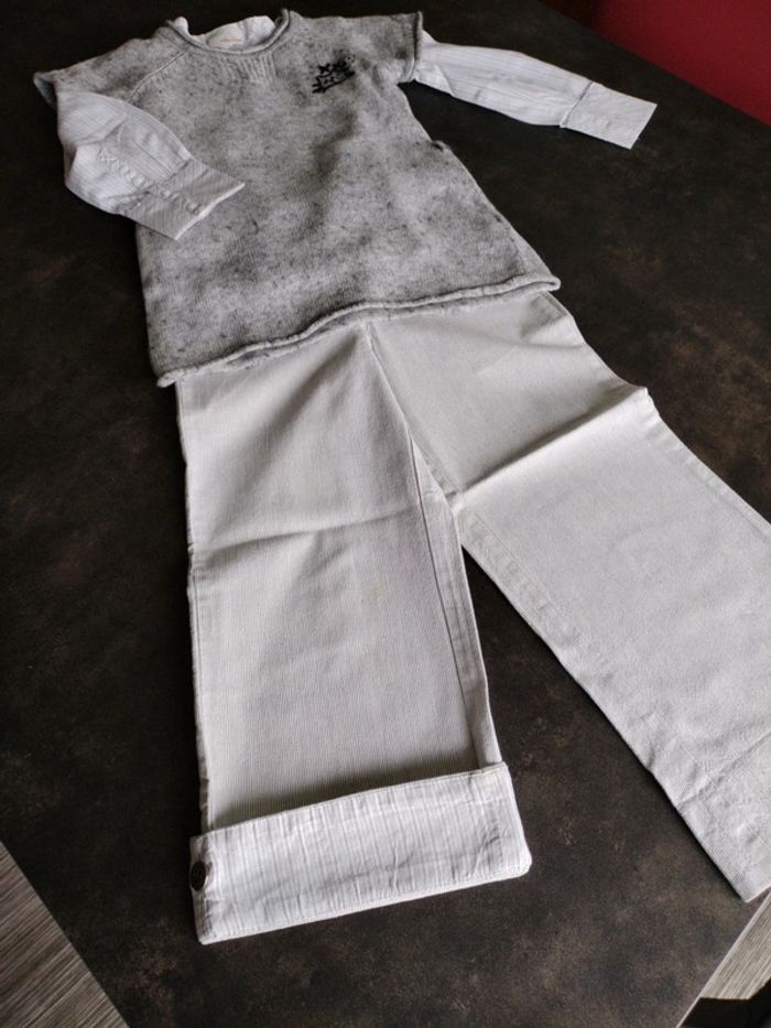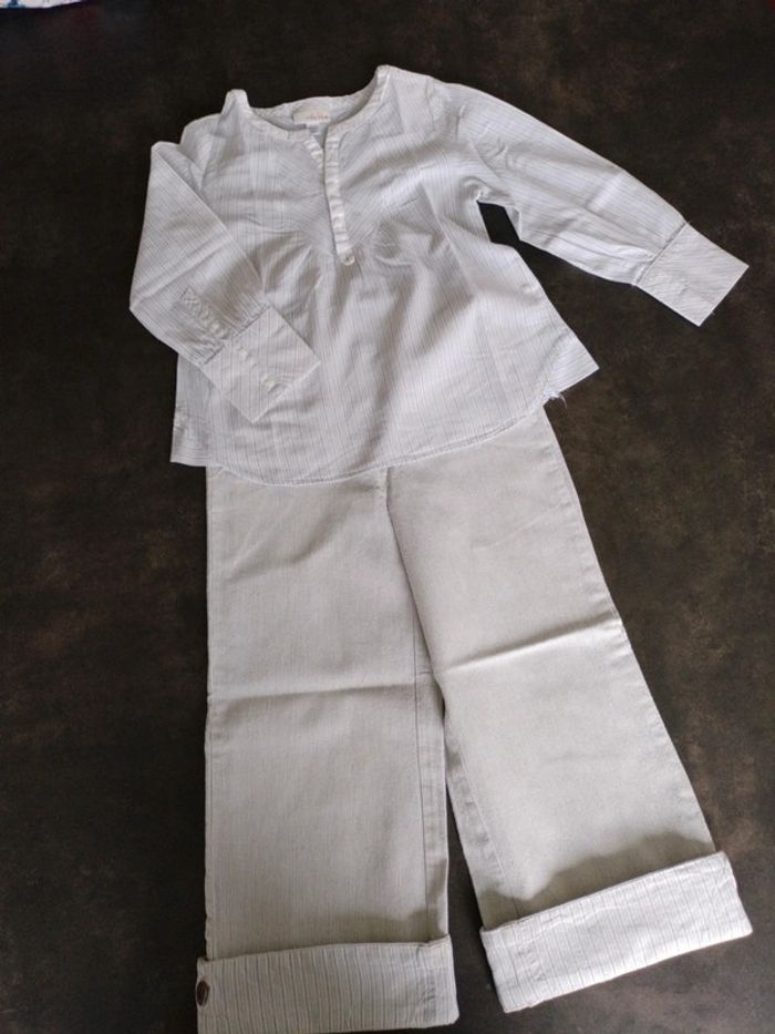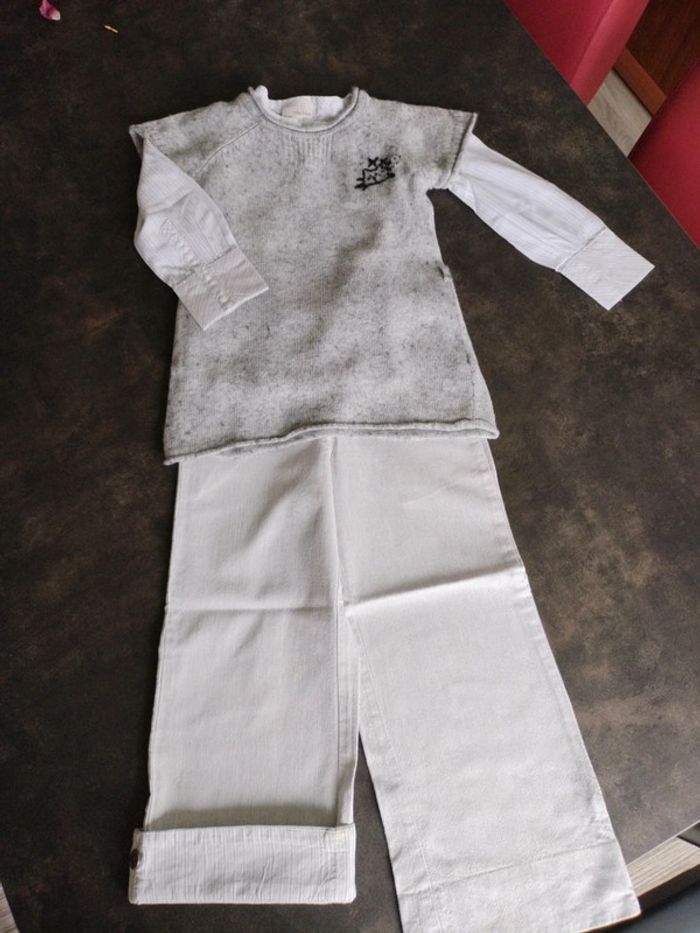 Un pantalon wide legs Mila Blue de Vertbaudet, en coton, léger, taille ajustable. Peut se raccourcir grâce à un bouton. Présence de légères tâches ( photos 7 et 8). Une blouse rayée Mila Blue de Vertbaudet, assortie au bas du pantalon, très légère. A noter une petite tâche de feutre à l'intérieur de la manche droite ( photo 12). Un pull manches courtes Sergent Major, contient de l'angora et de la laine d'agneau, tout doux. Maison non fumeur. #valerieravaisse4ans