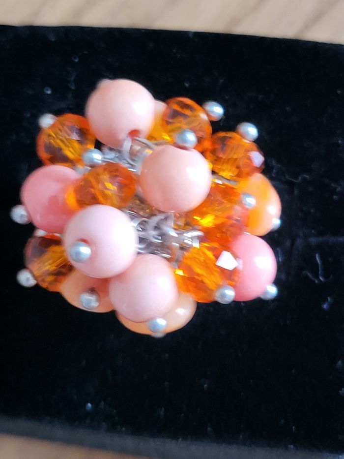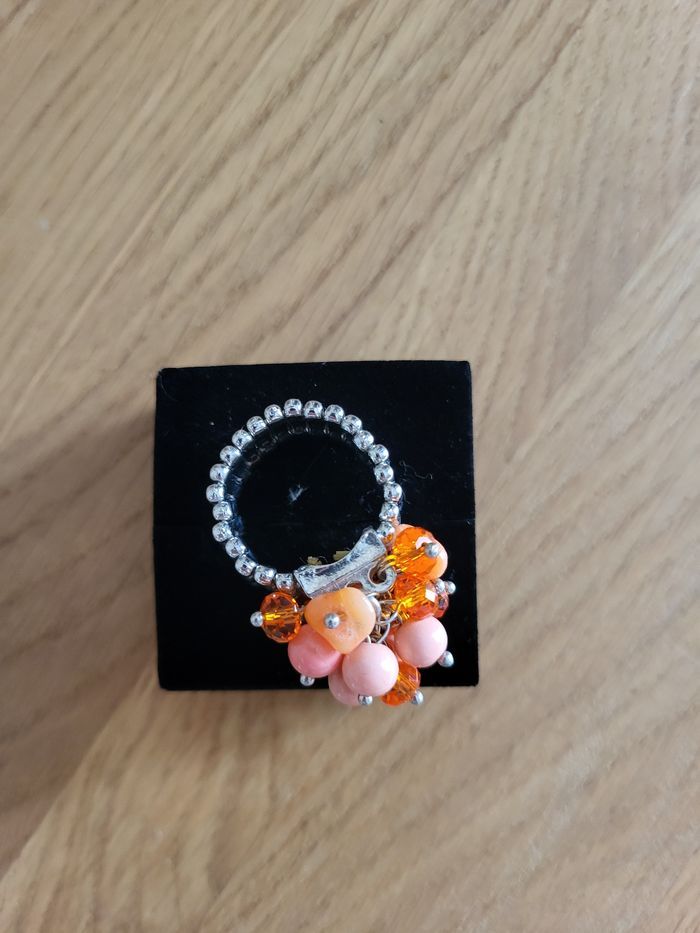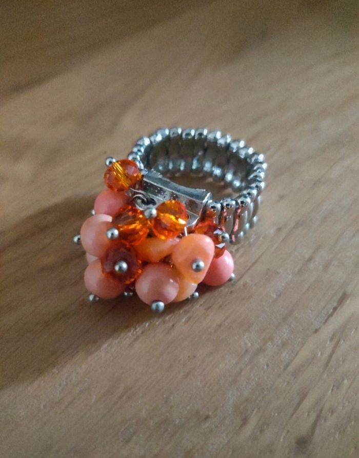 Bague fantaisie avec un bouquet de perles dans les tons orange corail Anneau extensible car élastiqué État neuf, n'a jamais été utilisée Vendu dans une pochette mais sans le support