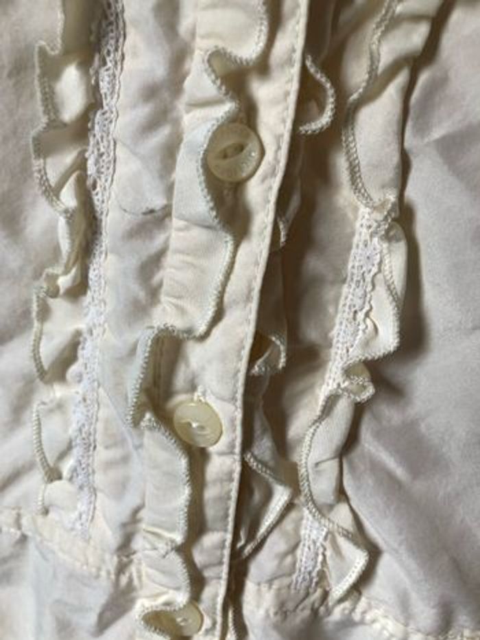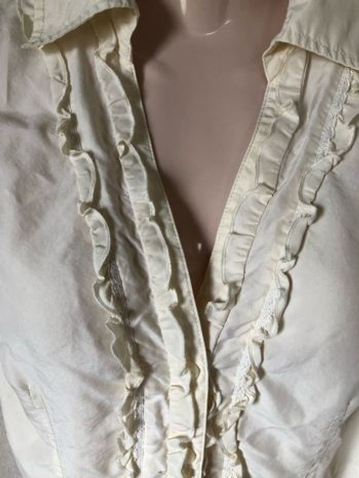 Chemise crème manches courtes Volants et dentelle sur le boutonnage et l’encolure en V 100% soie taille 6 Tommy Hilfiger Carrure 37,5 cm Aisselle à aisselle 47 cm Largeur à plat au niveau taille 39,2 cm Longueur 61 cm