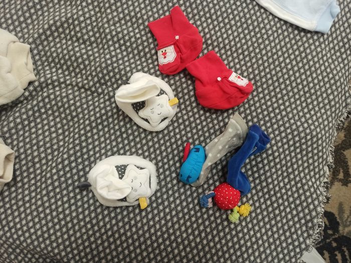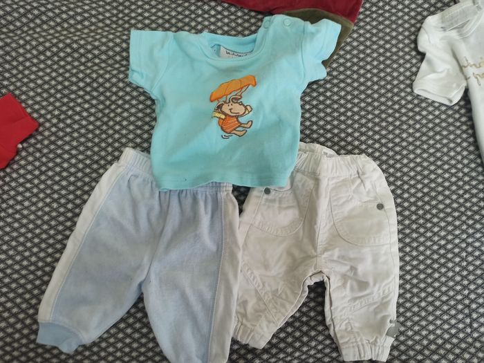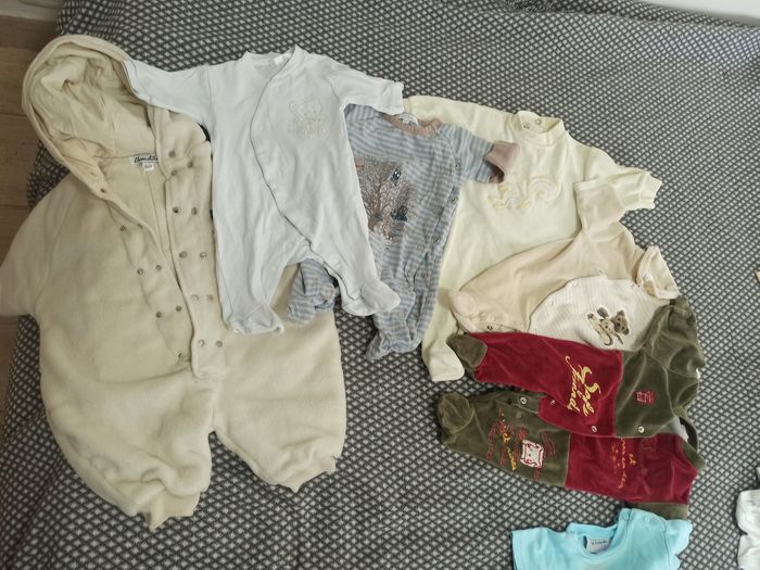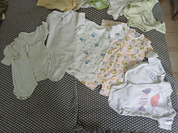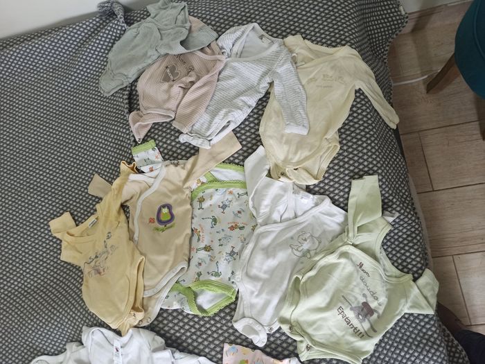 Lot 25 pièces 0 a 1 mois 1 gigoteuse sortie chaude 5 pyjamas manches longues (2plus léger) 2 pantalons + 1 t-shirt 2 chaussons + 2 jouets de pieds 7 bodys manches courtes 9 bodys manches longues Etat neuf, sans bouloches, filles/garçons