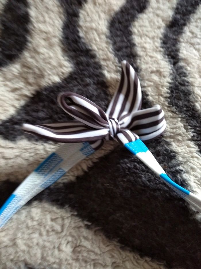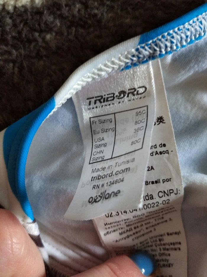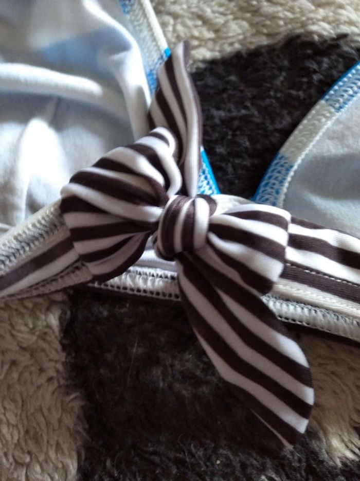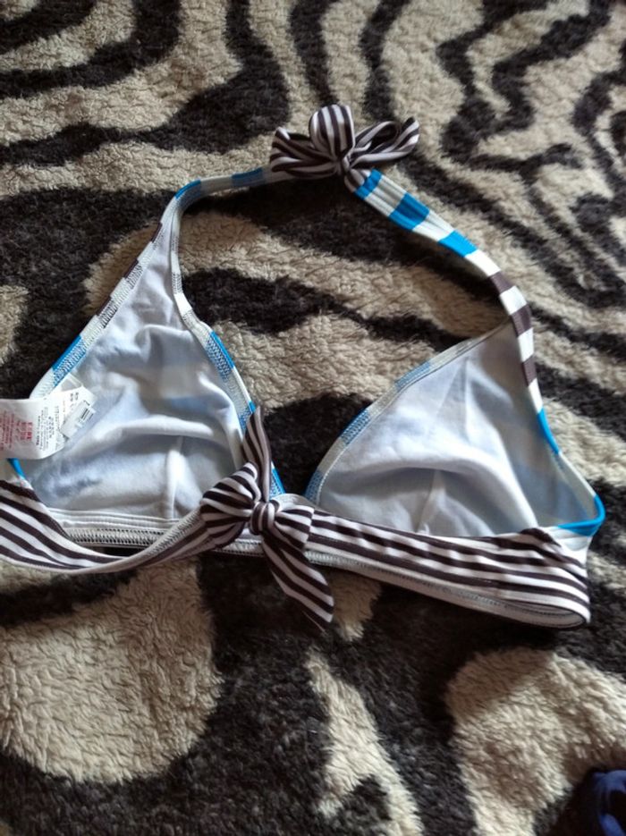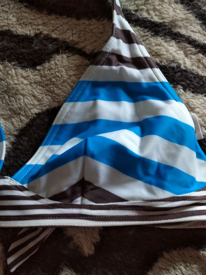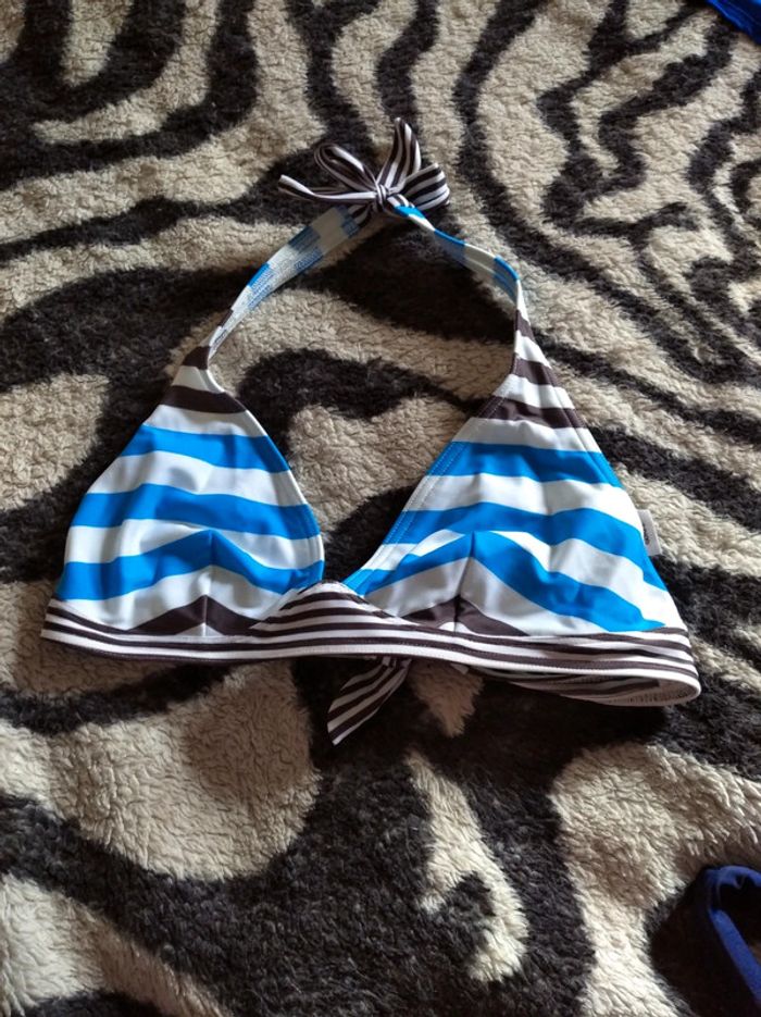Haut de maillot de bain bleu blanc et marron rayures Attache au cou et au dos avec ficelle/noeud Marque tribord Taille 95C