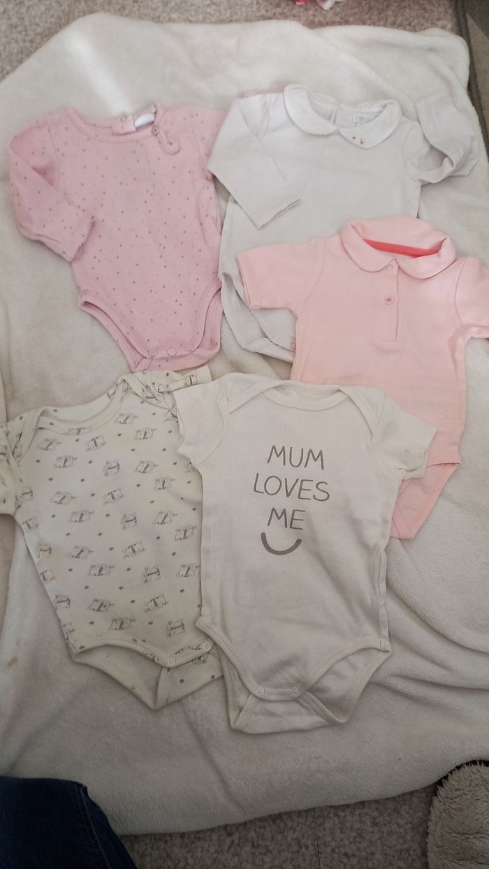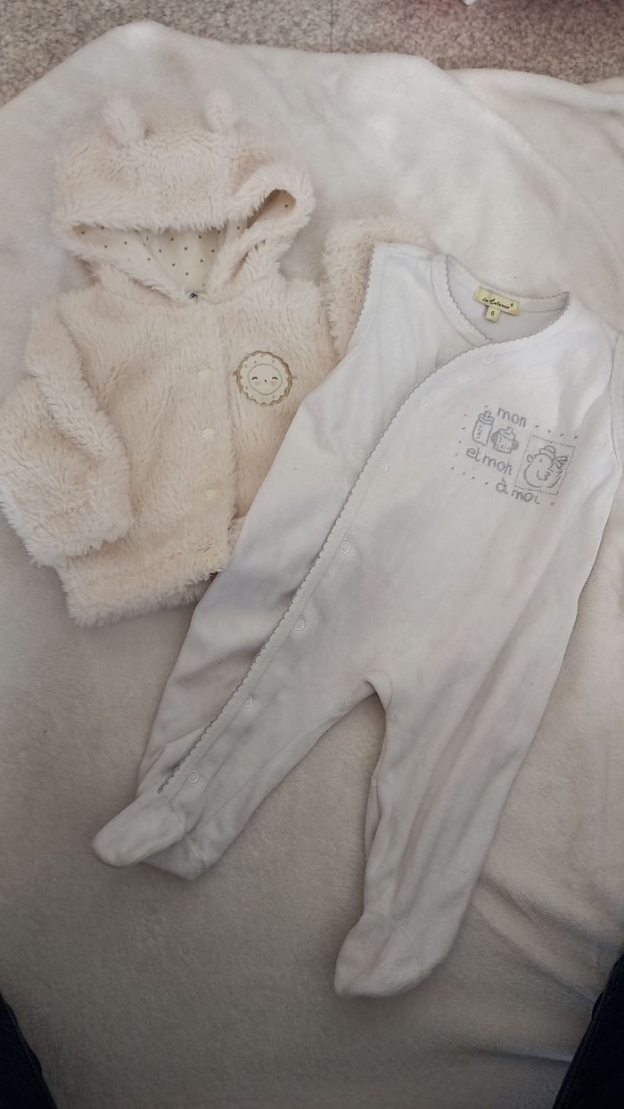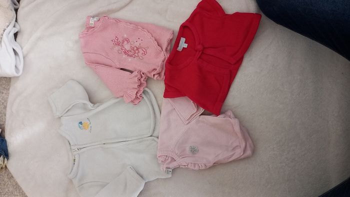 Lot comprenant 1 veste douce à capuche crème, 1 robe en jean's, 1 pyjama 1 pièce sans manches, 2 pantalons,3 gilets dont 1 manches courtes, 1 veste bleu ciel,5 bodies dont 2 manches longues les pressions du rose la peinture a un peu sautée, 3 manches courtes, 11 manches longues.