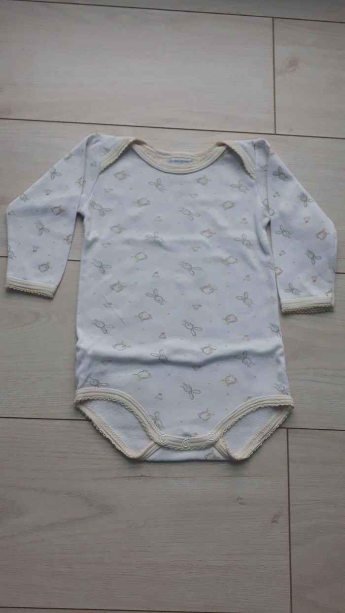 Bodie blanc avec motifs (lapin et ours) A manche longue Pression entre les jambes Taille 6 mois