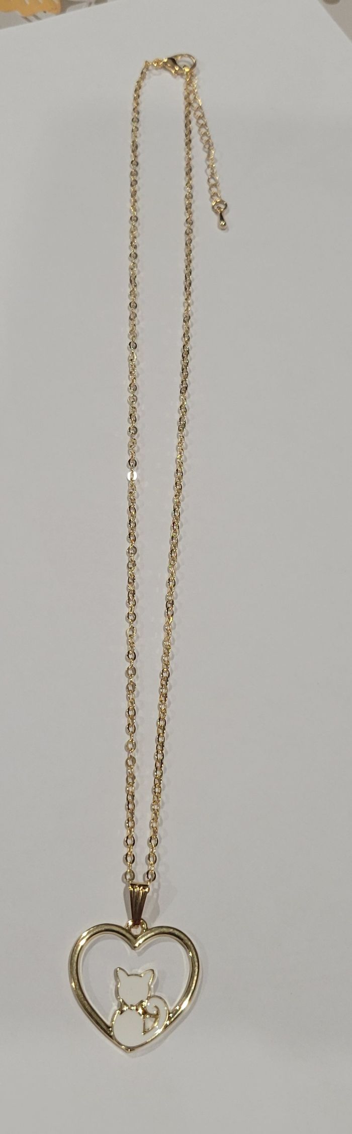 COLLIER COEUR CHAT BLANC ! NEUF ! Coloris doré. Longueur de la chaîne: 40 cms . Dimensions du coeur silhouette petit chat blanc : 2,3 x 2,3 cms . Produit neuf sous emballage. Envoi rapide, soigné