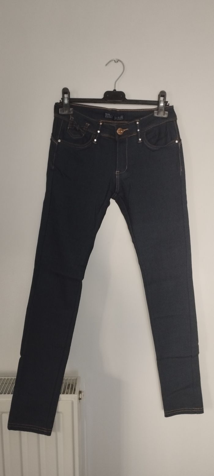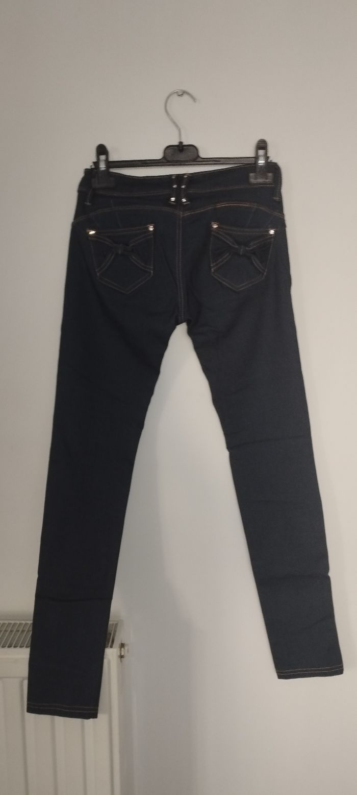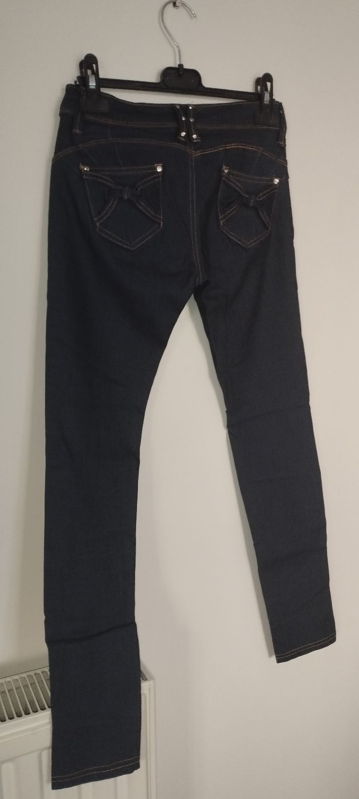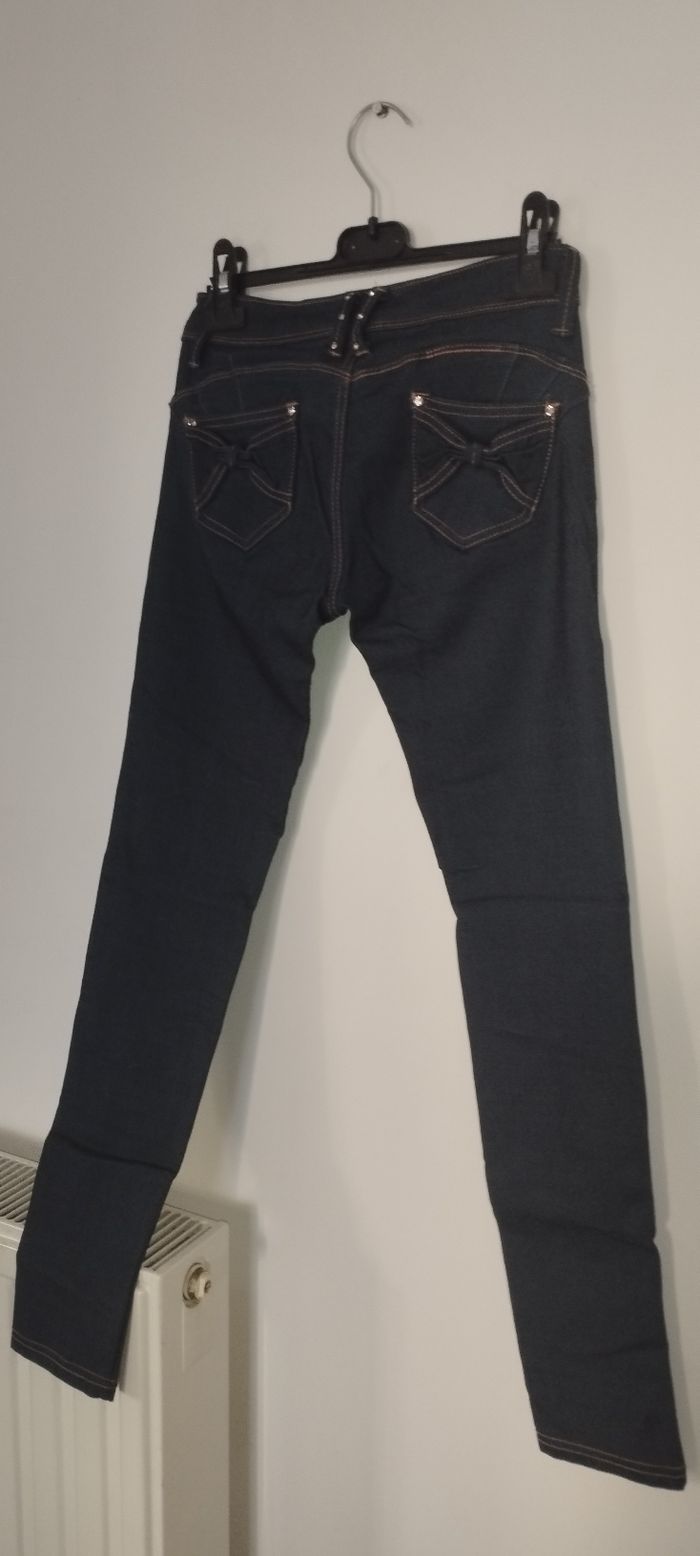 Jean skinny bleu foncé avec strass et noeuds Taille basse, prêt du corps et effet push-up Taille 38 Neuf sans étiquette jamais porté