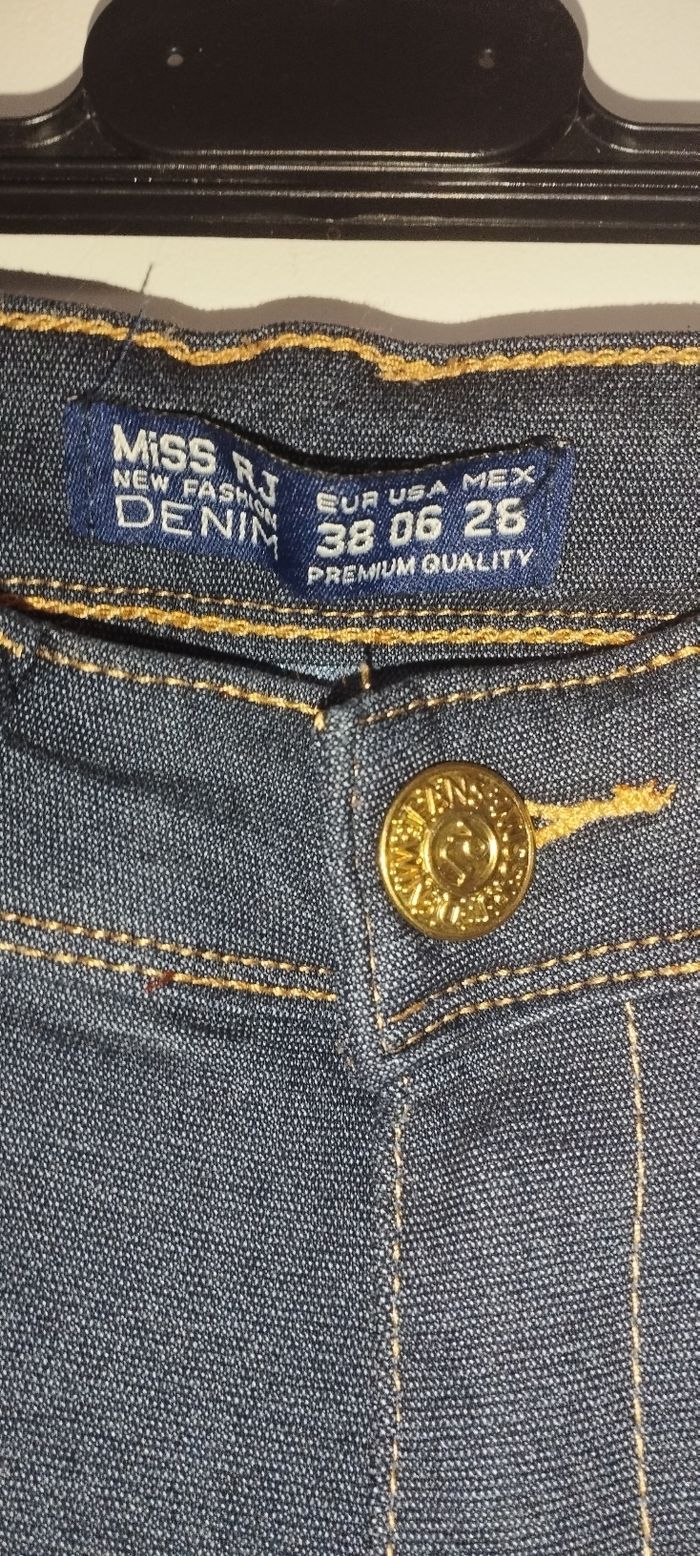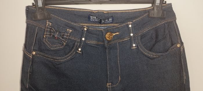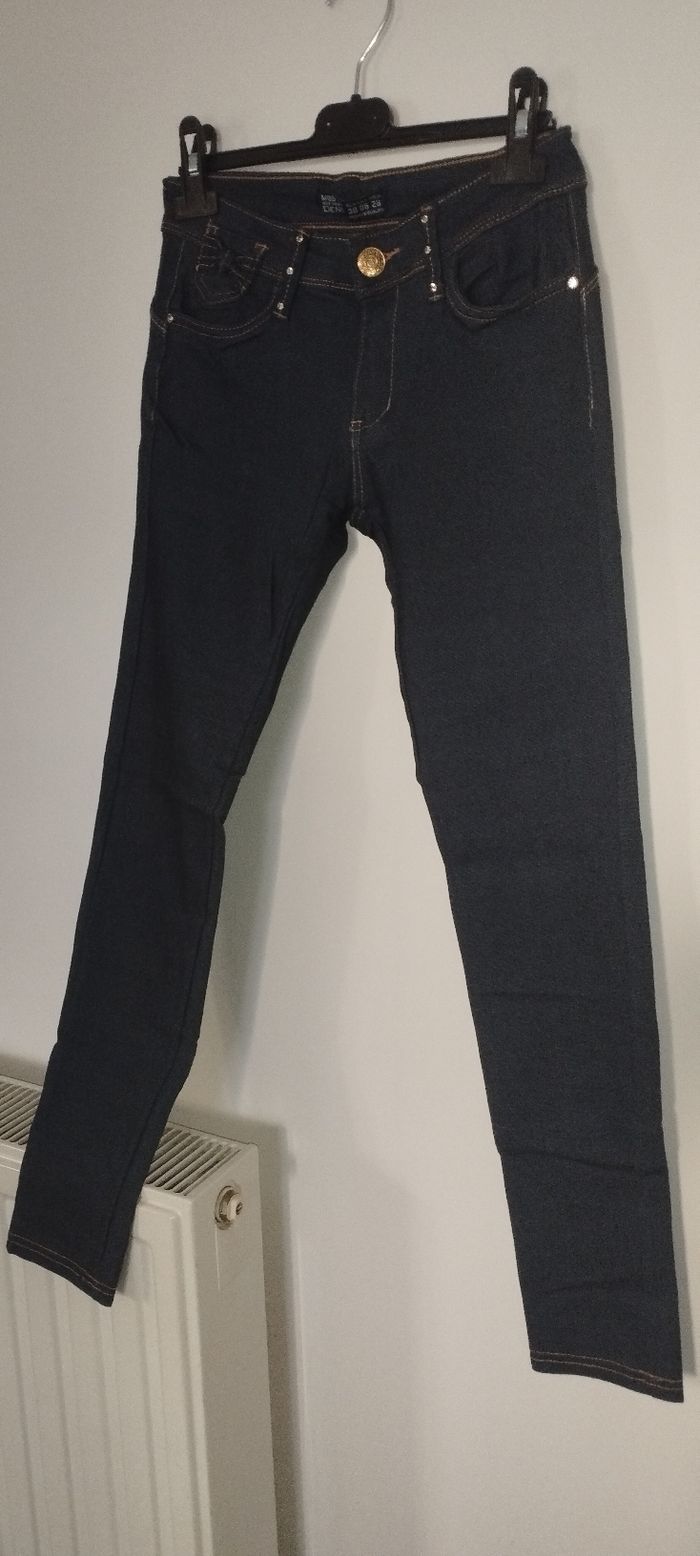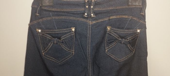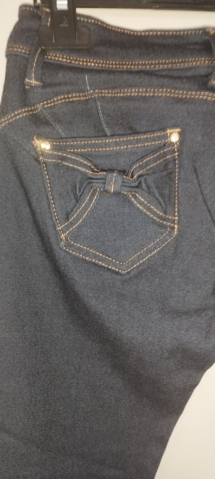 Jean skinny bleu foncé avec strass et noeuds Taille basse, prêt du corps et effet push-up Taille 38 Neuf sans étiquette jamais porté