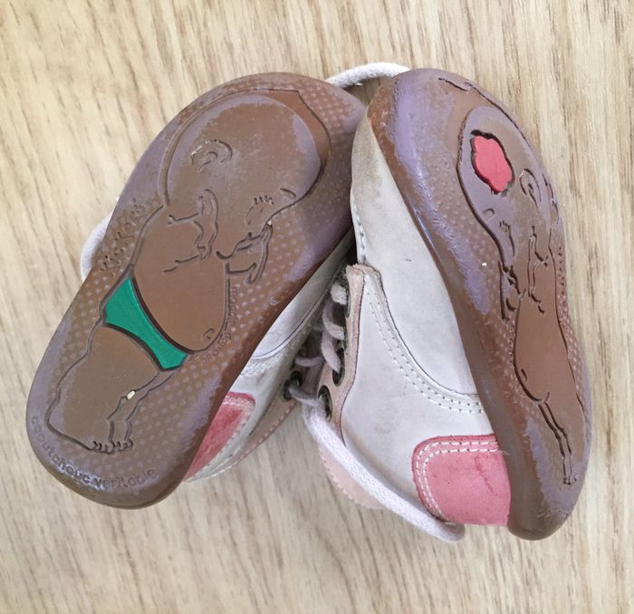 Taille 19 État satisfaisant, chaussure droite beaucoup plus tachée que la gauche. De couleur lilas très pâle et rose