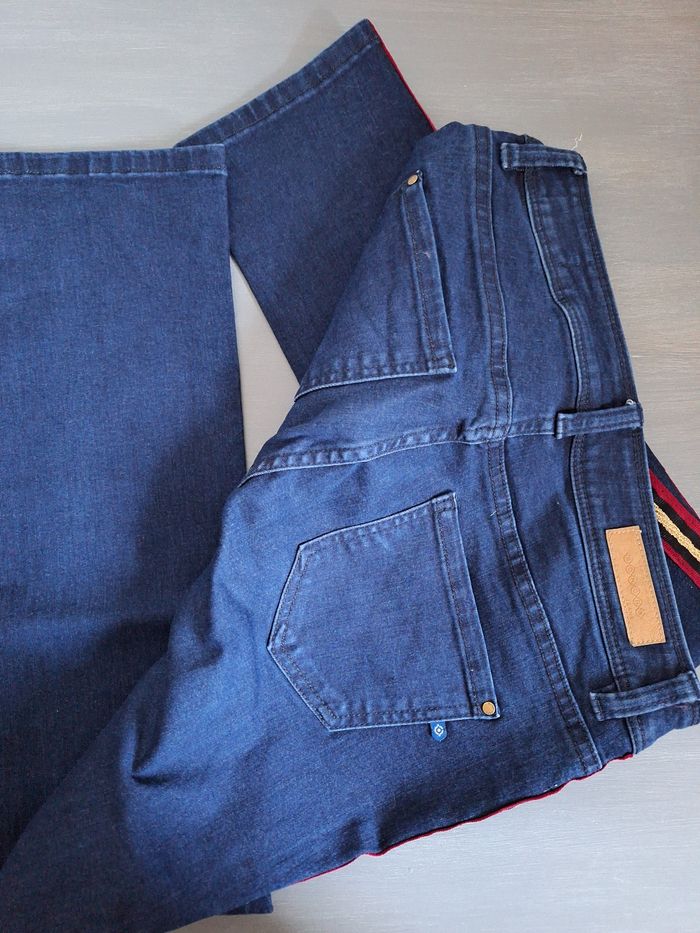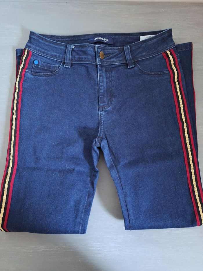 FEMME 36 / S N°1601 jeans bleu foncé Ligne coté , bordeau/noir/doré 54% coton 25% polyester 19% viscose 2% elasthane Longueur 90 cm Slim fit Taille 36 / s Neuf plus d étiquette 🏷 Bonobo 8,50€ #kelly_femmeT36