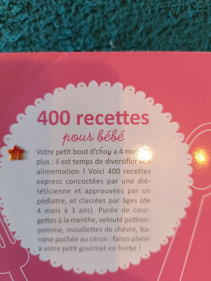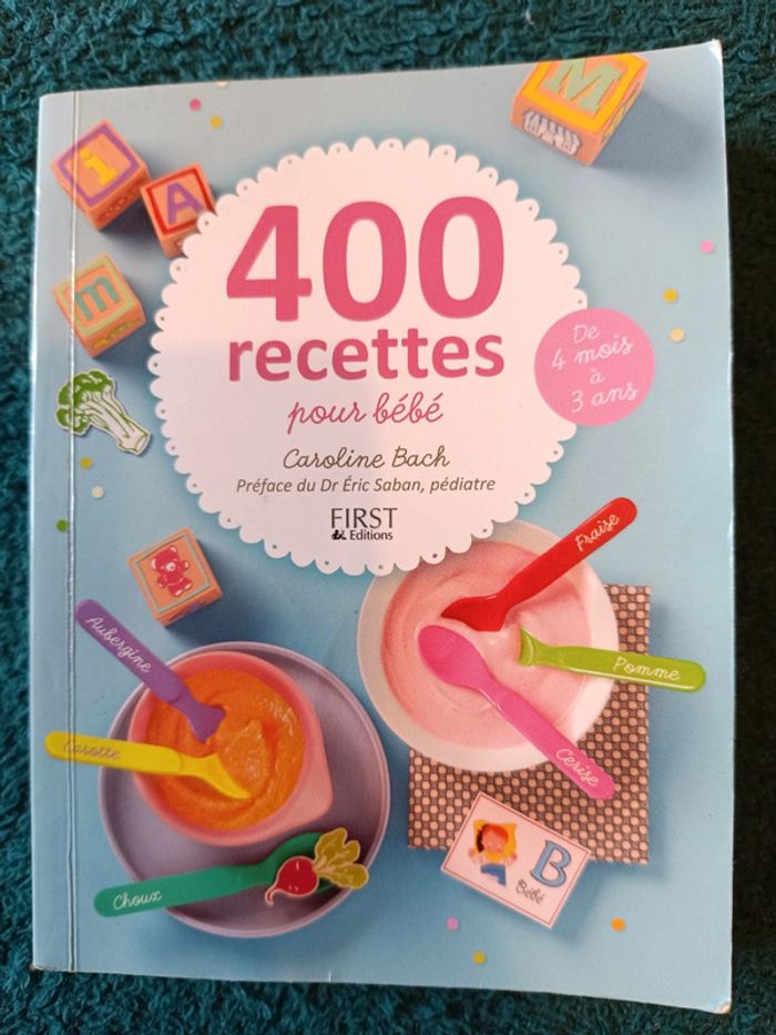 Livre de recette pour bébé. Livre en bon état même si certaines pages ont été un peu pliées.