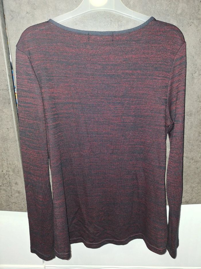 T-shirt manches longues bordeaux noir chiné, inscriptions en surpiqûres devant un peu abîmée (voir photo) sinon peu porté en bon état, marque Mim, taille 38