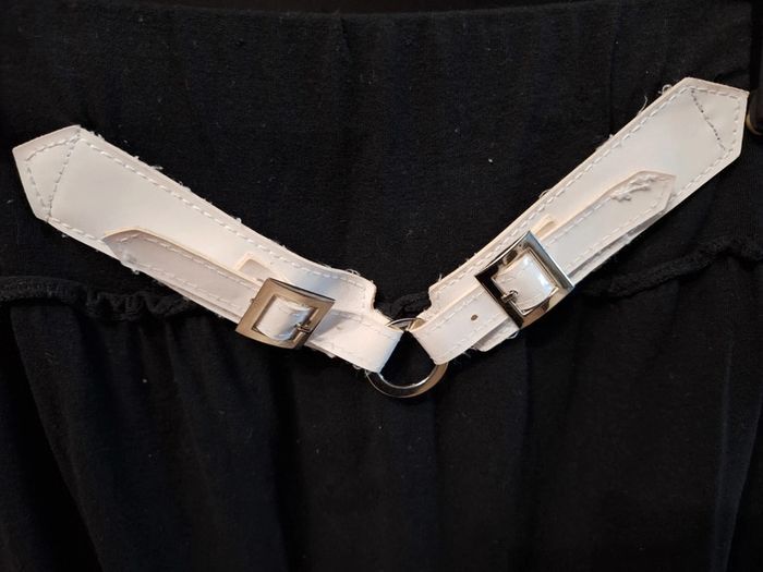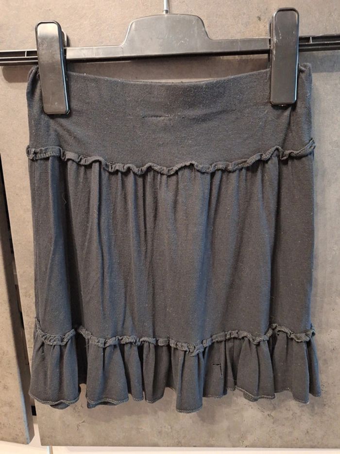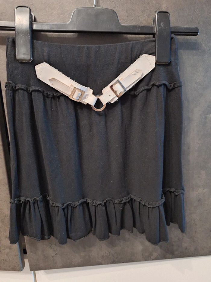 Jupe courte noire avec fausse ceinture blanche devant, taille élastiquée, marque P'tit Môme, taille 36, portée mais en très bon état