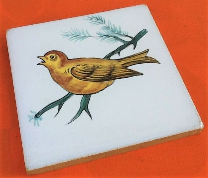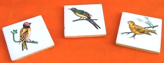 3 Carreaux anciens en céramique Décor d' oiseau sur branche