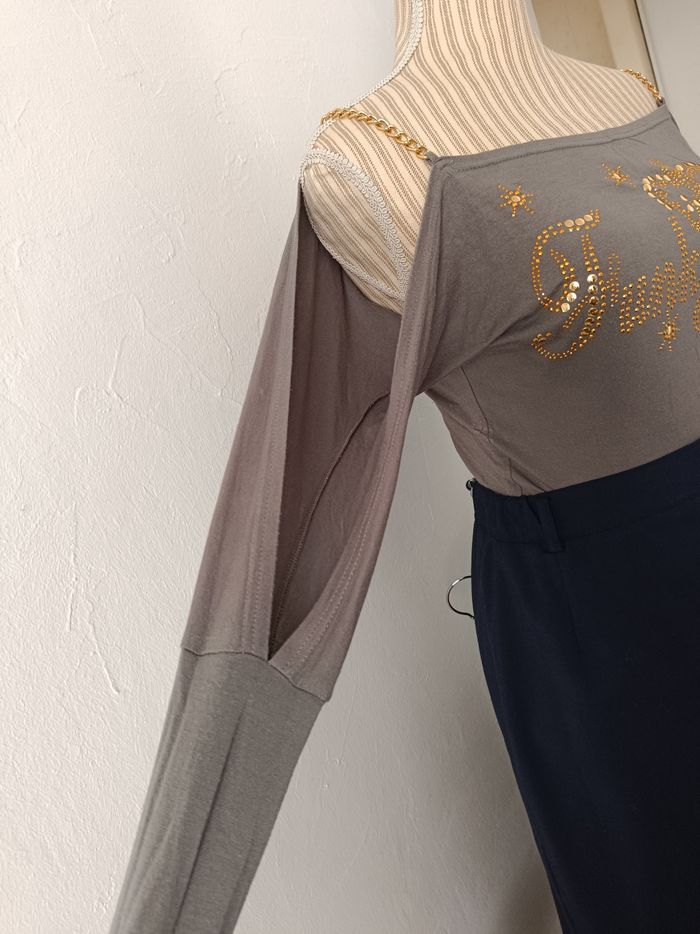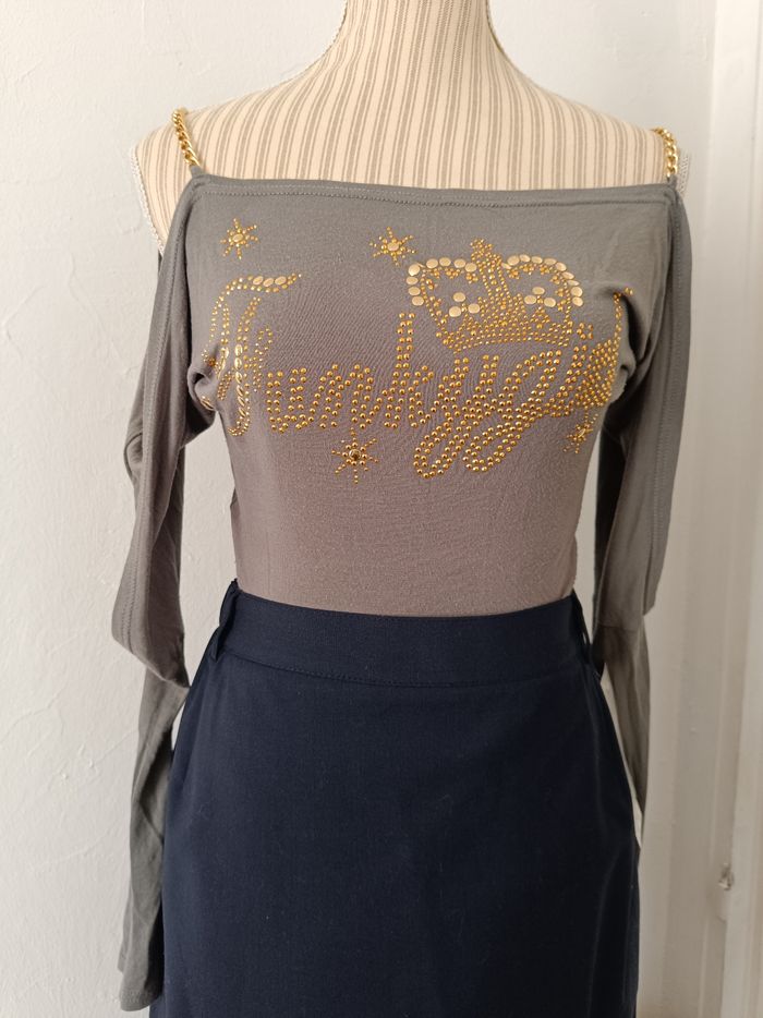 T-shirt en taille 38/40. Avec Strass et ouverture sur les bras. Bretelles en chaîne.