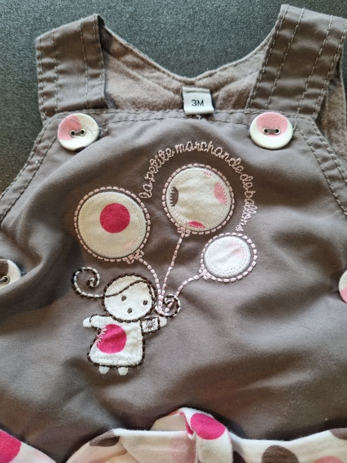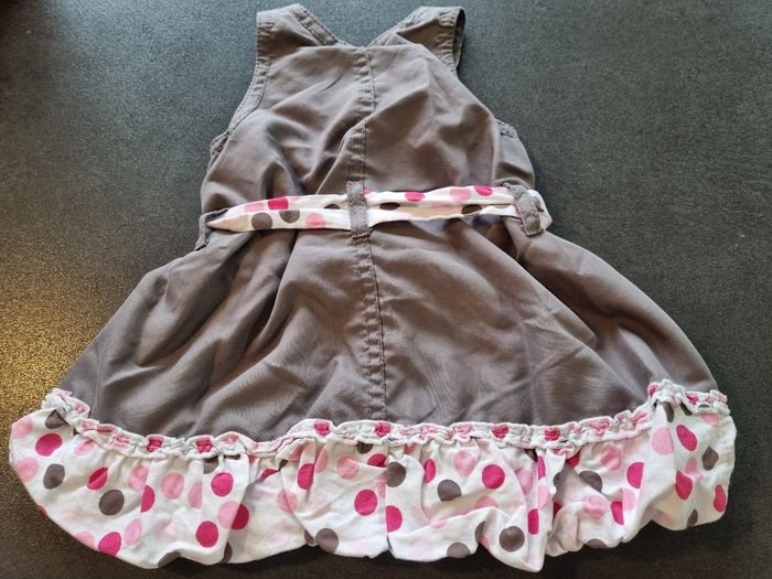 Robe manches courtes ton gris, motifs pois en bas et ceinture décorative, pas de marque identifiée, 3 mois. Très bon état Possibilité de faire un lot. N'hésitez pas si questions ou besoin d'autres photos.