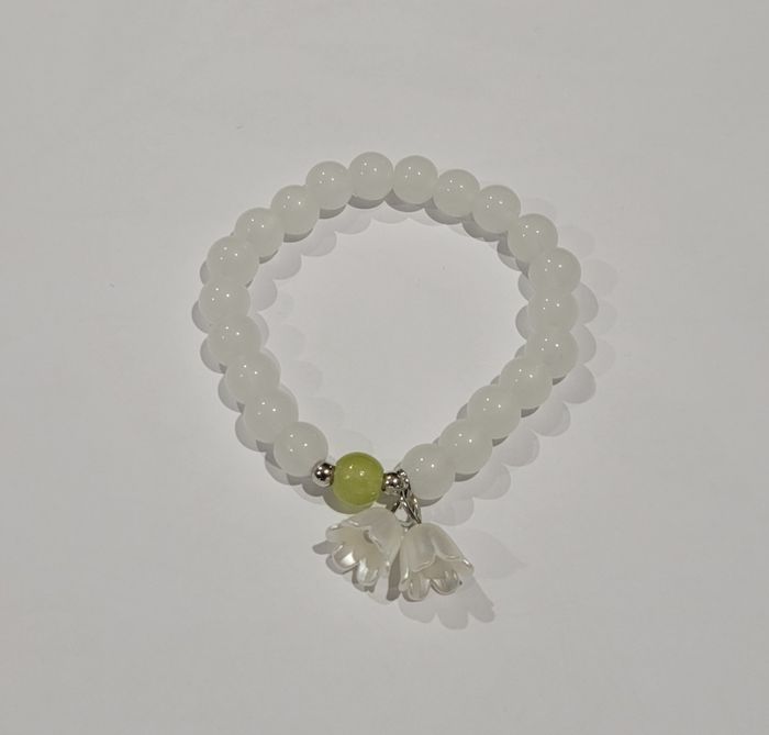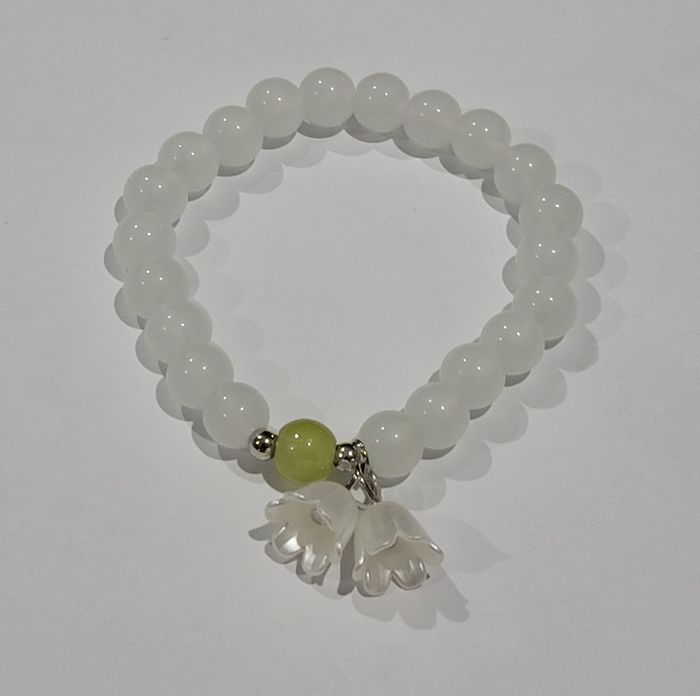BRACELET MUGUET CLOCHETTES PERLES BLANCHES ! NEUF ! Bracelet perles longueur 17 cms . Perles blanches + 1 perle verte +2 petites clochettes muguet . Diametre : 17 cms N'hésitez pas à regarder mes autres ventes. Envoi rapide et soigné.