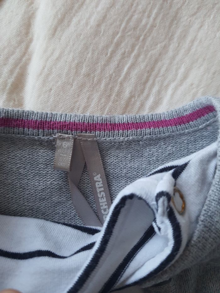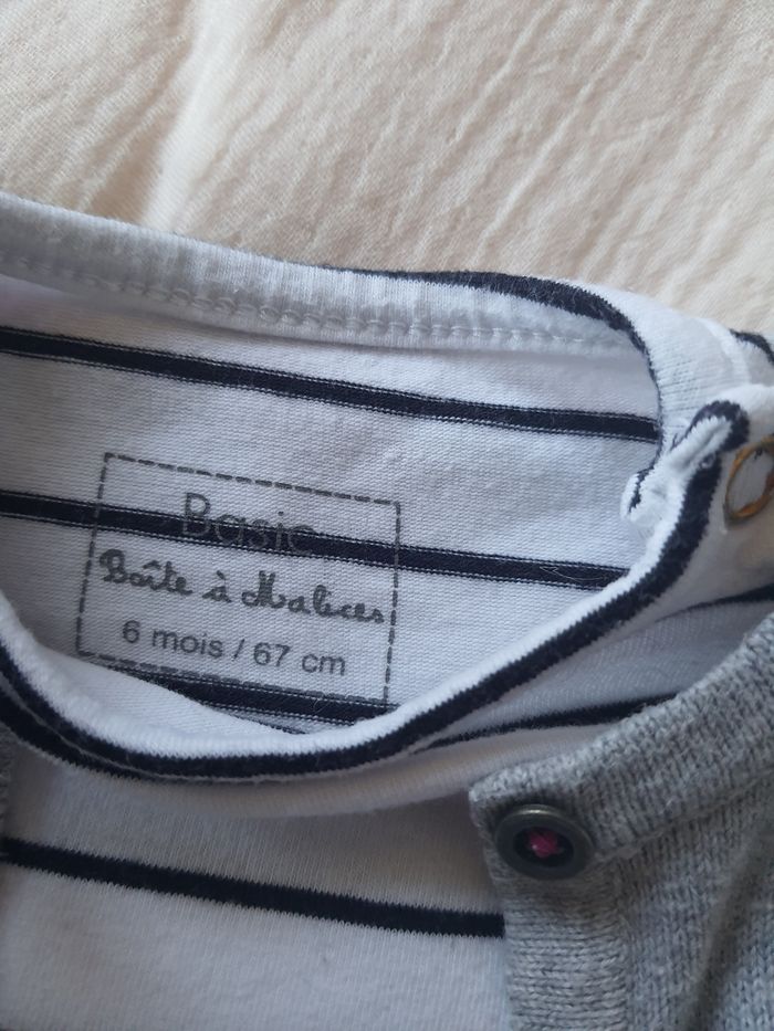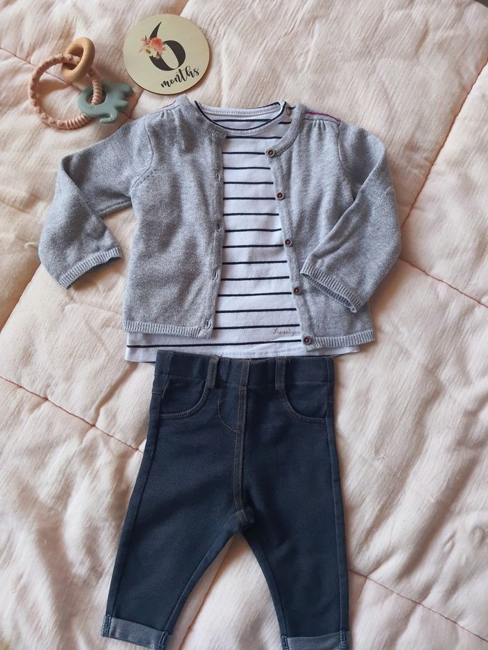 T-shirt marinière boîte à malices Legging jean kiabi Gilet gris Orchestra 6 mois Très bon état
