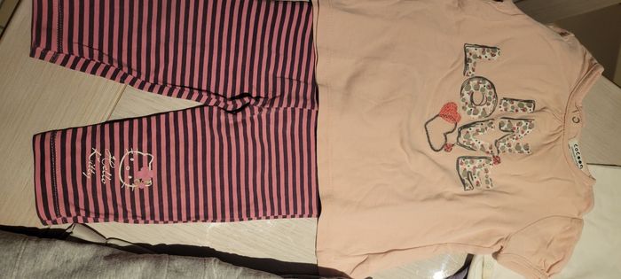 Lot été fille 12 mois. 2 bodys La redoute 1 veste fait main et maison 1 tee-shirt manches courtes orchestra 1 ensemble blouse + leeging 1 tee shirt manches longues La redoute 1 leeging Hello Kitty 1 robe Kimbaloo 1 pantalon Kitchoun 1 chapeau Bon état #33coco_fille12mois #33coco_lot
